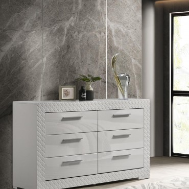 Elevate your bedroom decor with this stunning dresser, designed for both beauty and function. The high gloss finish enhances the contemporary Italian style, while the 3-dimensional diamond tile emboss adds a touch of sophistication. Six spacious drawers offer ample storage for clothing and accessories, each featuring felt lining in the top drawers to protect delicate items. The dresser is built with sturdy English dovetail joinery and 45mm thick metal glides, ensuring smooth operation and durability. This piece is perfect for those who appreciate fine craftsmanship and modern design.