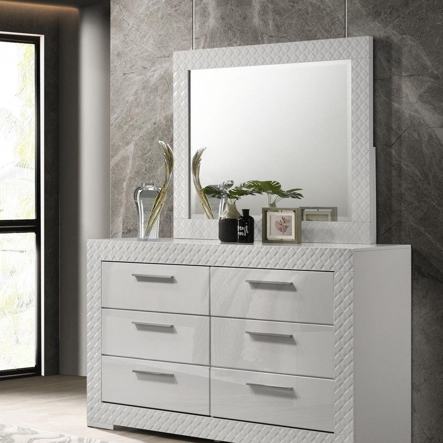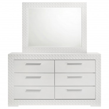 Bring a touch of modern luxury to your bedroom with this dresser and mirror set. Featuring a high gloss finish and 3-dimensional diamond tile emboss, this set exudes contemporary Italian style. The dresser offers ample storage with six spacious drawers, including felt-lined top drawers for delicate items. The matching mirror adds a cohesive element, enhancing the set's sophisticated design. This dresser and mirror set is perfect for those who appreciate refined aesthetics and quality craftsmanship.