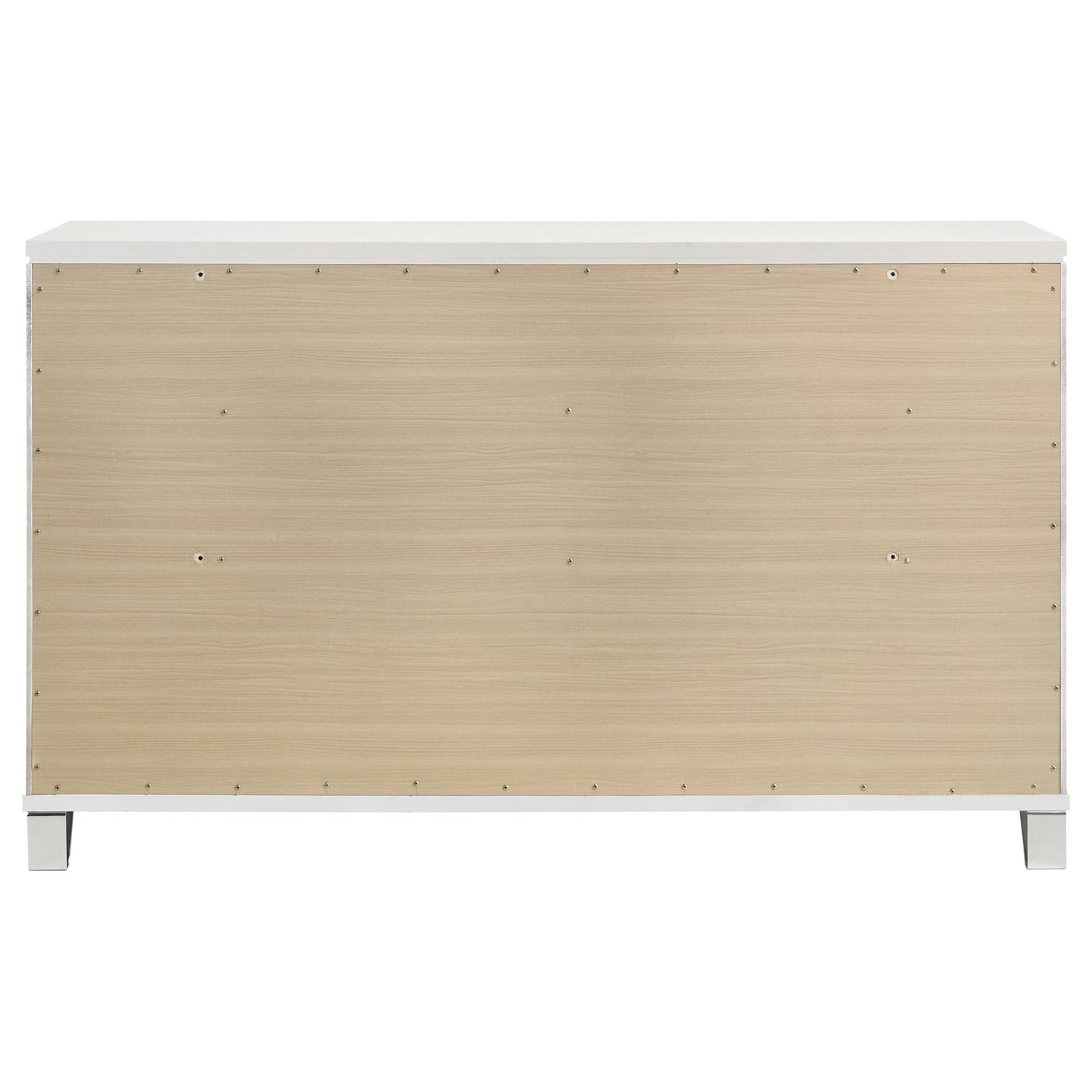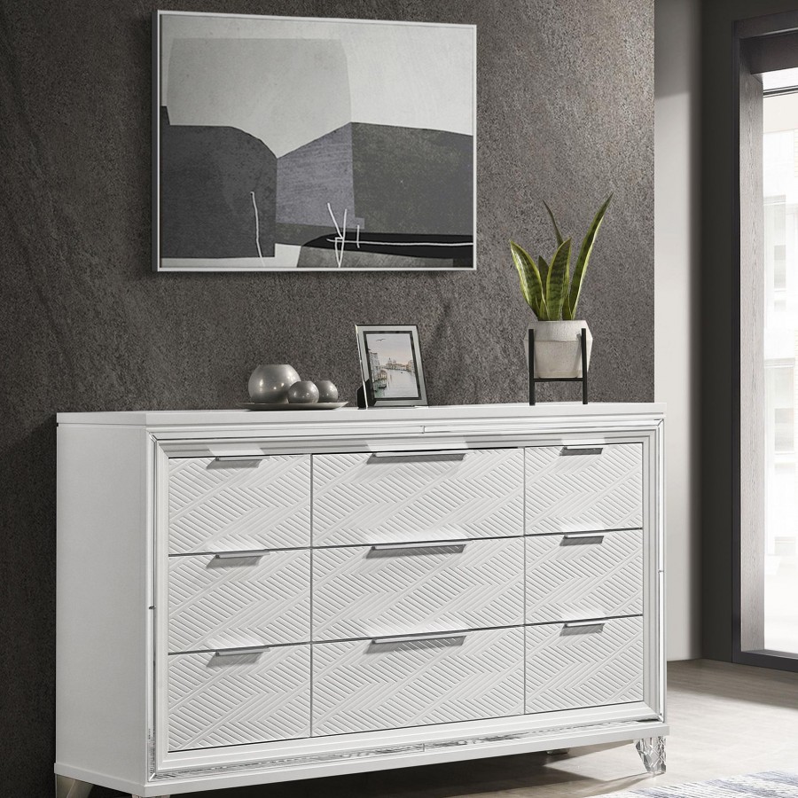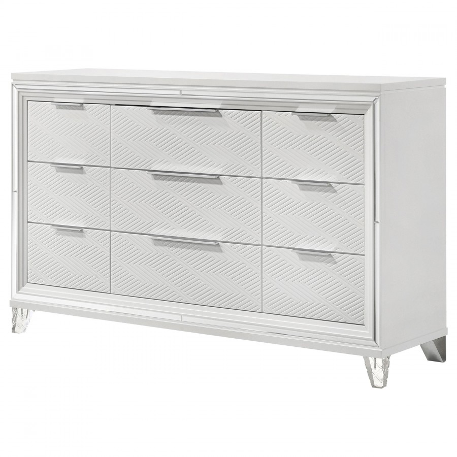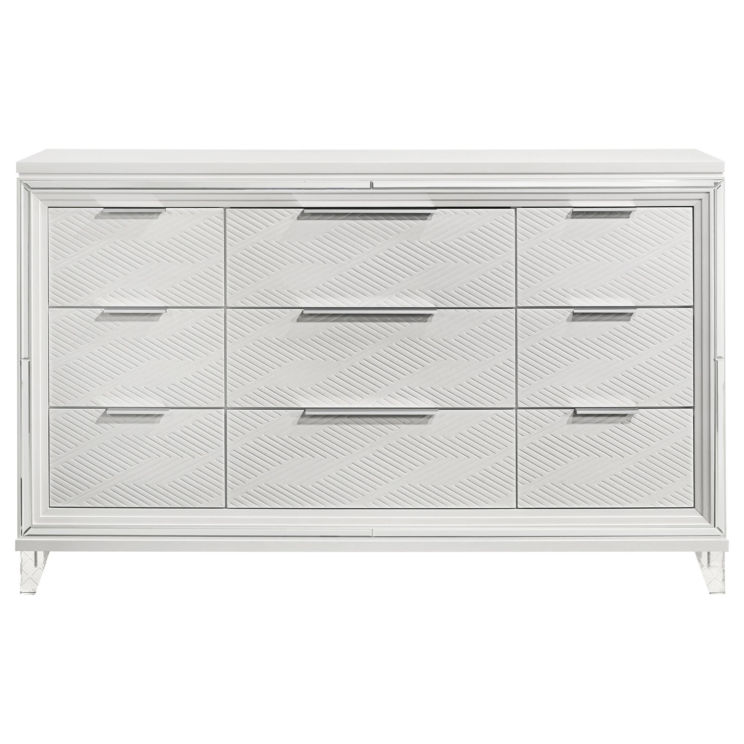 Add a touch of elegance to your bedroom with this spacious 9-drawer dresser, featuring a modern Italian design. The white finish, combined with picture framed recessed panels and embossed herringbone graphic patterns, creates a sophisticated look. Accented with mirror framing, acrylic legs, and polished chrome metal hardware, this dresser offers ample storage space. The top center drawer includes a removable jewelry tray, and all top drawers are felt-lined for added luxury. Crafted from rubberwood, MDF, and mirror, this dresser combines style and practicality.