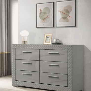 Elevate your bedroom decor with this stunning dresser, designed for both beauty and function. The high gloss finish enhances the contemporary Italian style, while the 3-dimensional diamond tile emboss adds a touch of sophistication. Six spacious drawers offer ample storage for clothing and accessories, each featuring felt lining in the top drawers to protect delicate items. The dresser is built with sturdy English dovetail joinery and 45mm thick metal glides, ensuring smooth operation and durability. This piece is perfect for those who appreciate fine craftsmanship and modern design.
