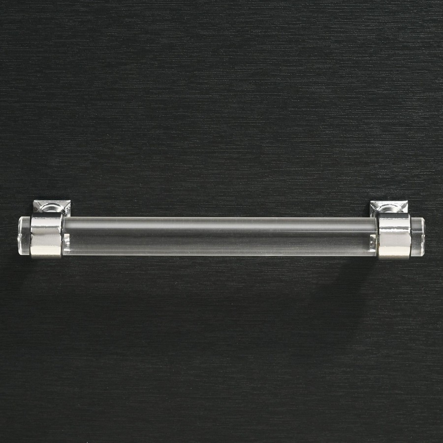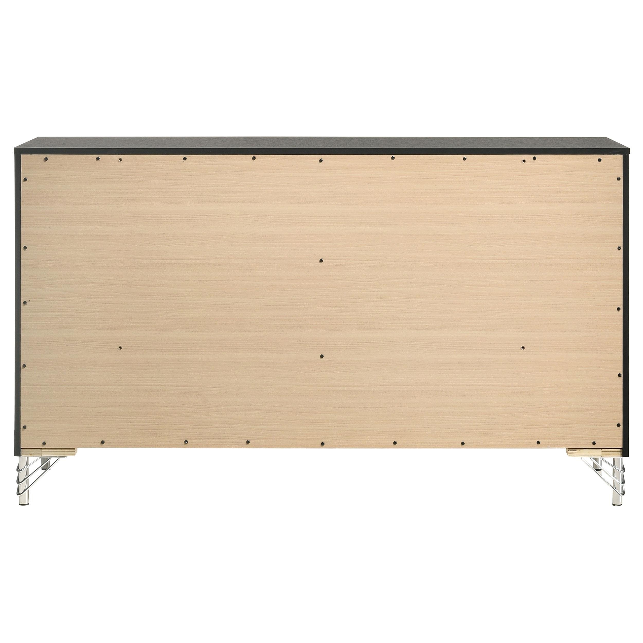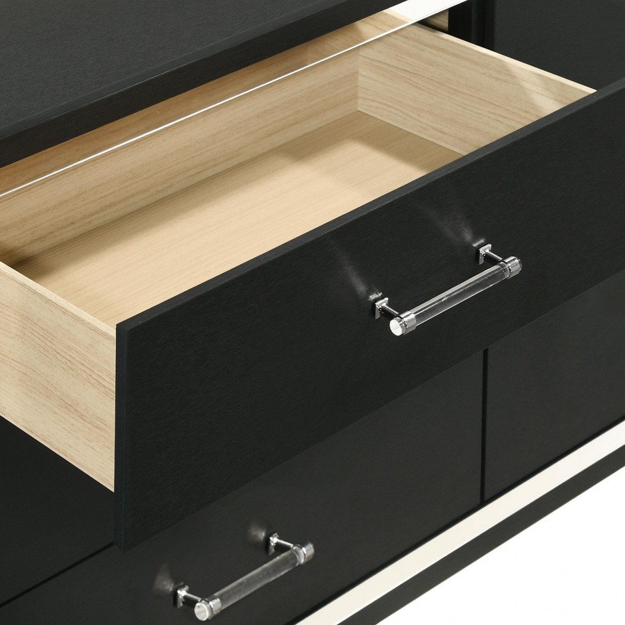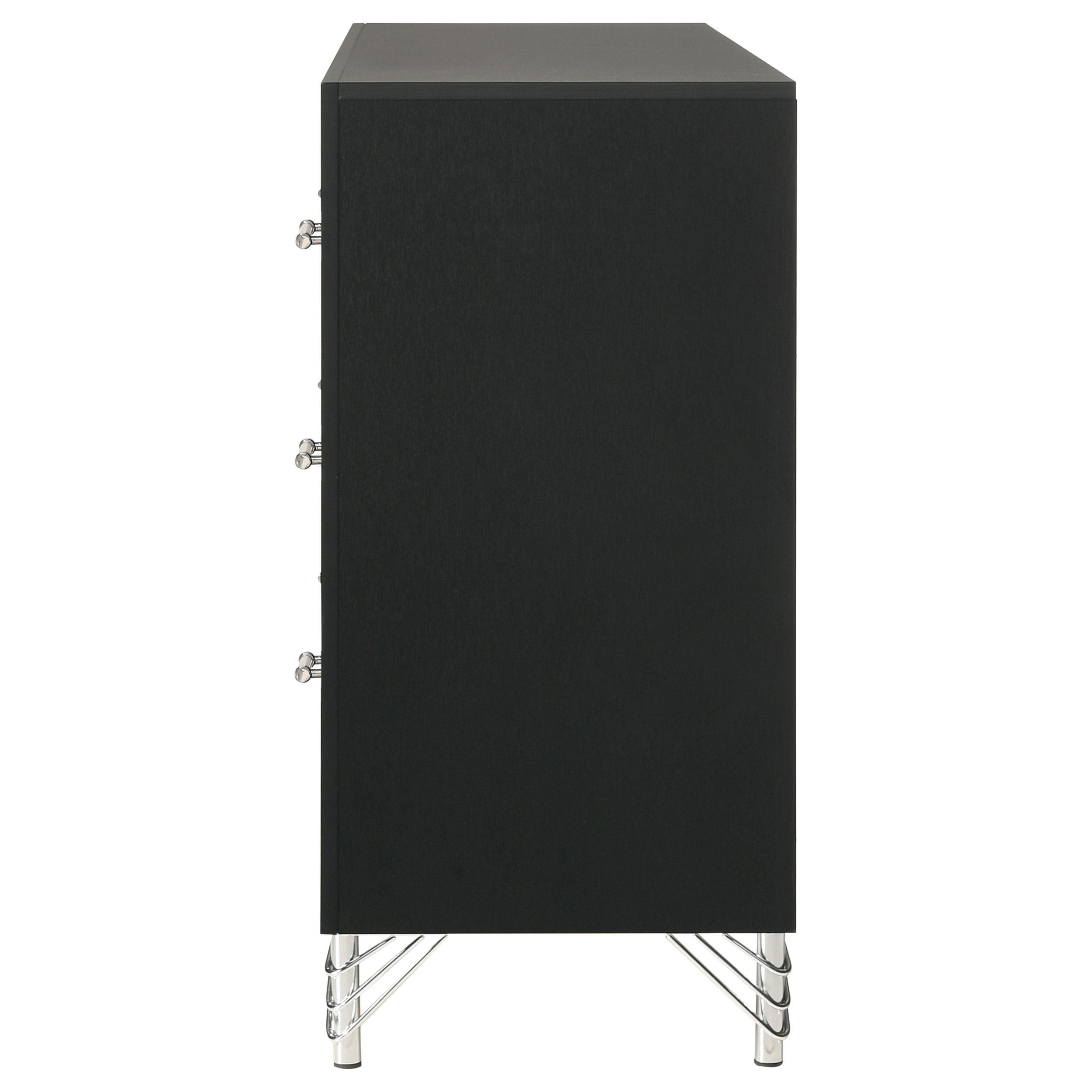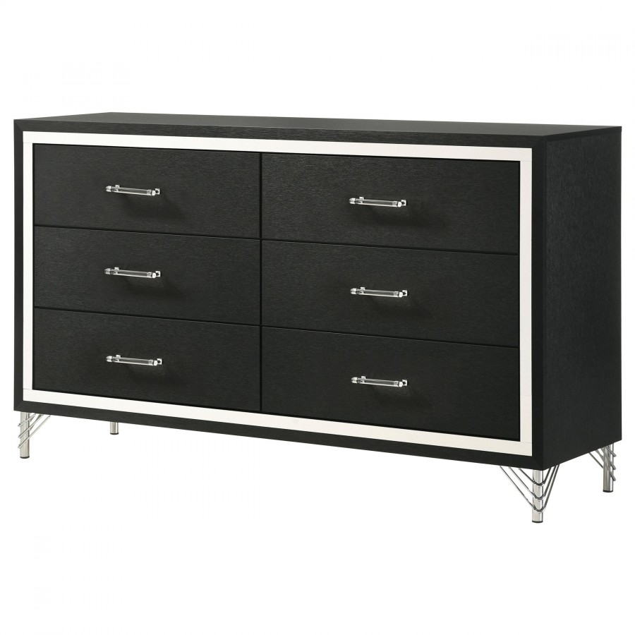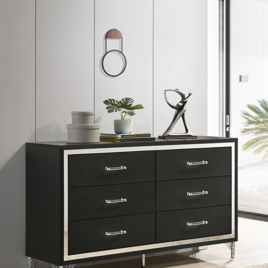 Accentuate surrounding decor with the sophistication of a modern six-drawer dresser. Designed for ample storage, it features a refined look with spacious drawers ideal for everything from clothing to accessories and linens. Its bold black finish is crisp and chic, complemented perfectly with rich, cool chrome trim that gleams in the light. Decorative legs have hairpin inspired style, offering a stylish touch of vintage energy. Long bar pulls complete the look with polished perfection.