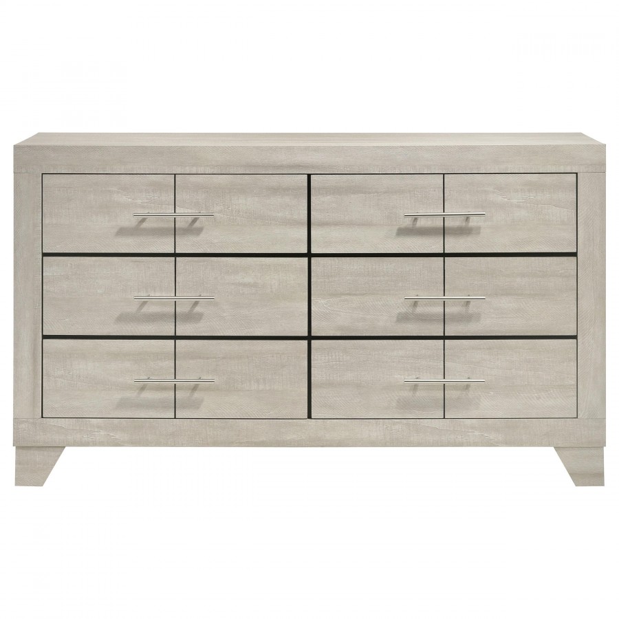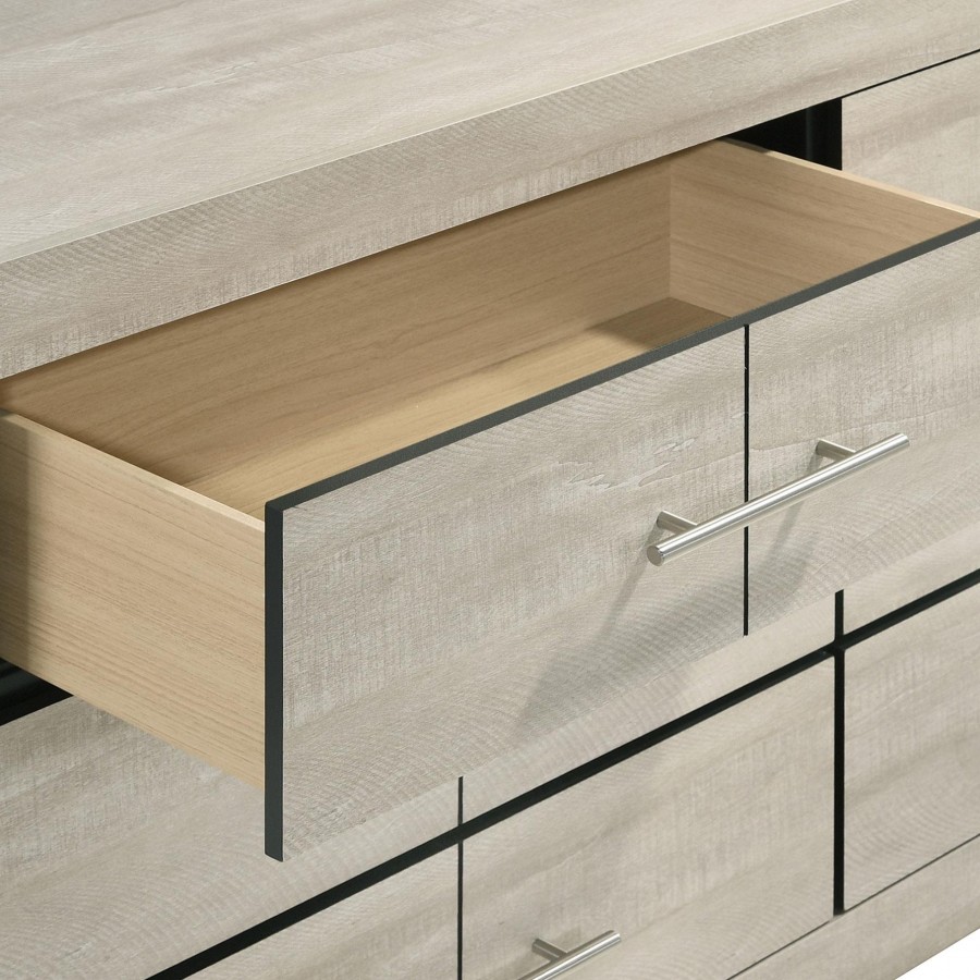 This six-drawer dresser combines modern style with a rustic edge, creating the perfect balance of elegance and functionality for your bedroom. With a rustic cream finish over rough-sawn, white-washed engineered paper veneer, it exudes a warm yet contemporary feel. The extra-wide polished nickel handles add a sleek contrast, enhancing its sophisticated look. Constructed from durable engineered wood, the dresser features English dovetail joinery and Center metal glides, ensuring smooth operation and lasting quality. Its spacious drawers offer ample storage to keep your space organized and stylish.