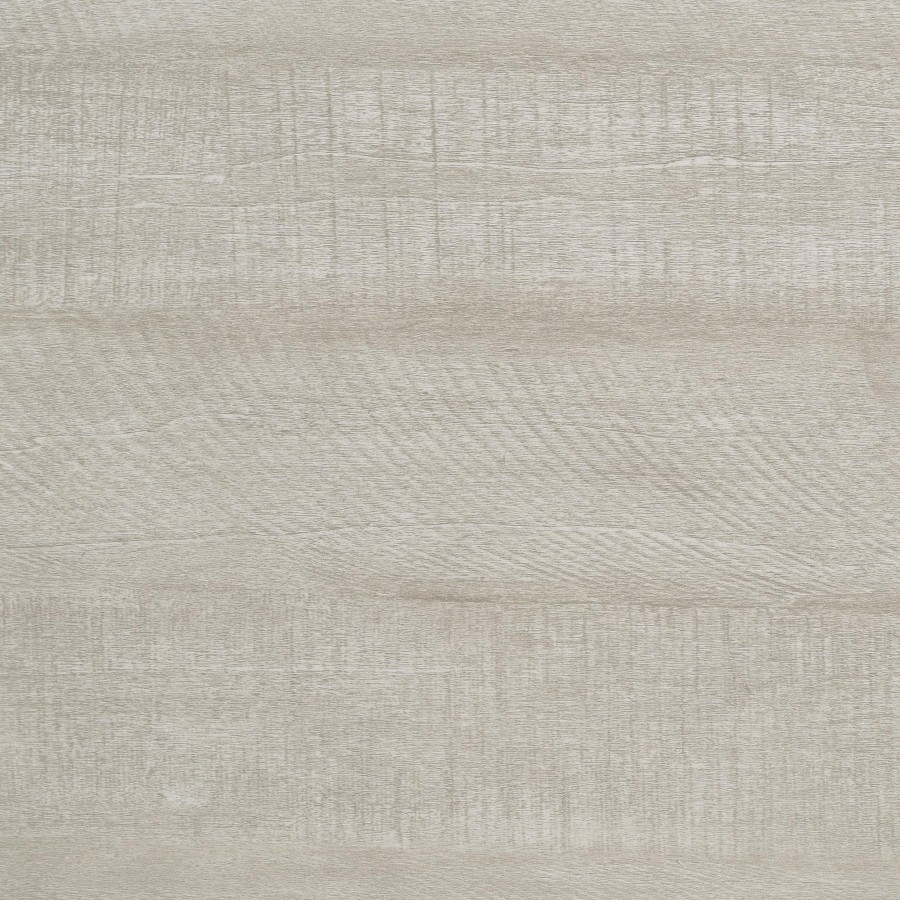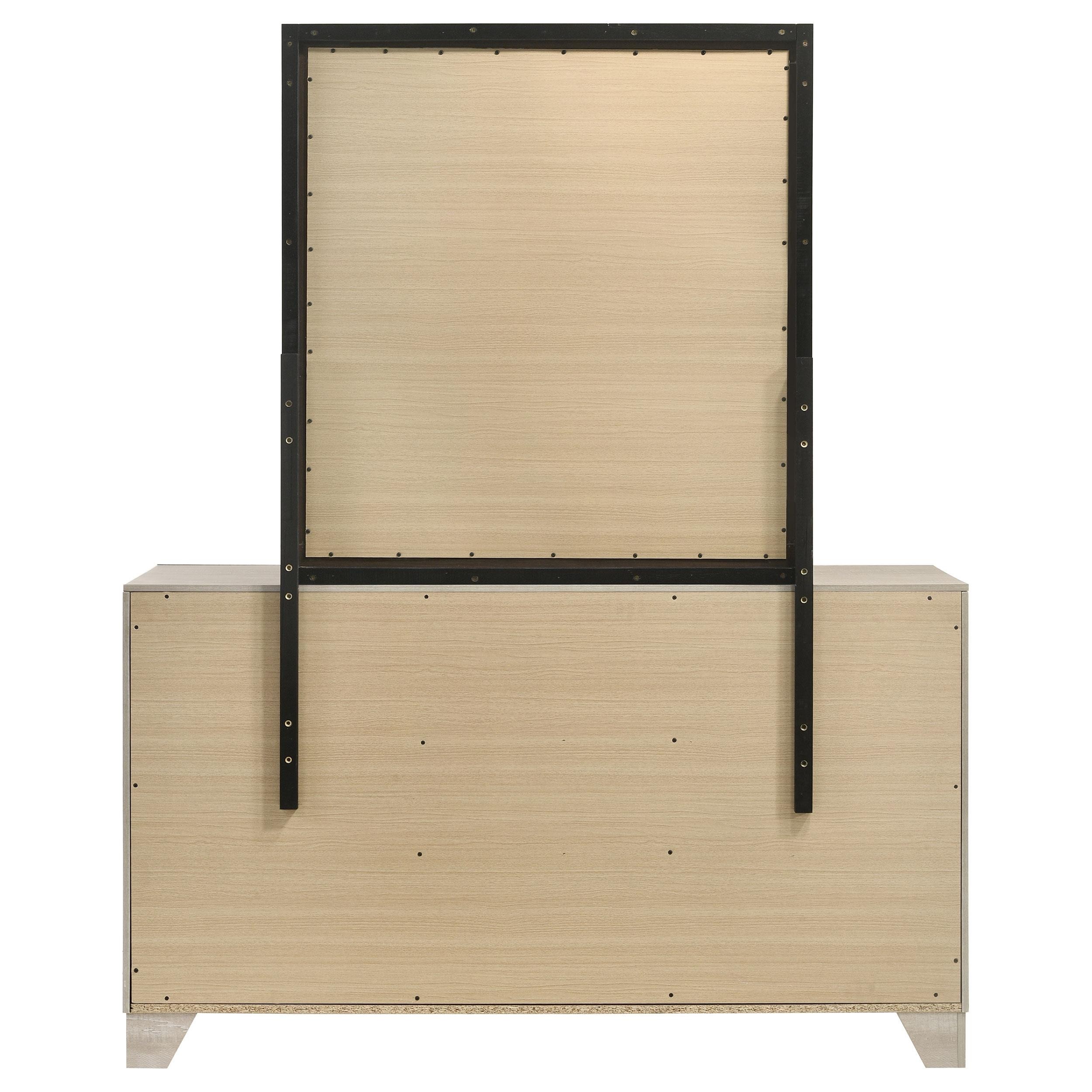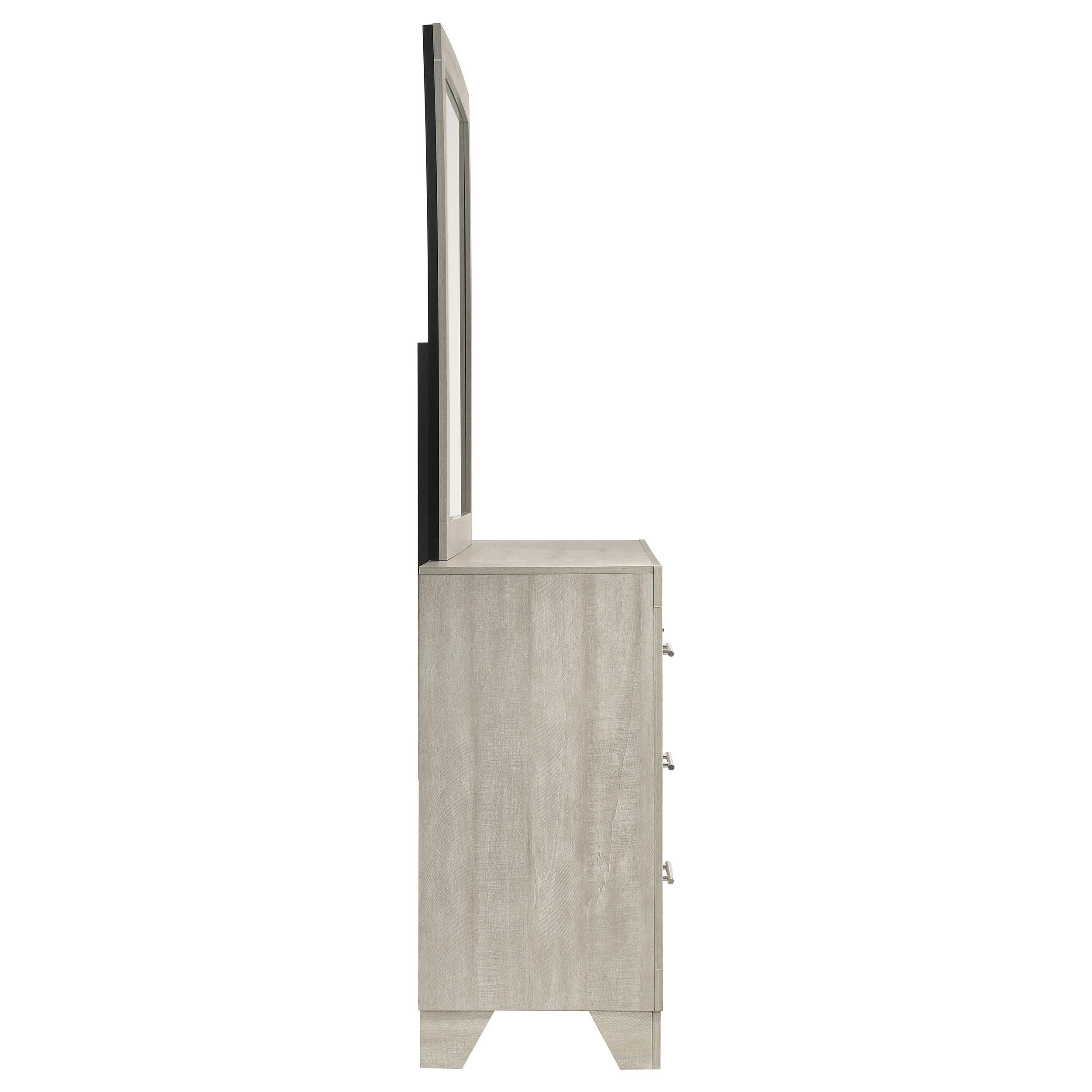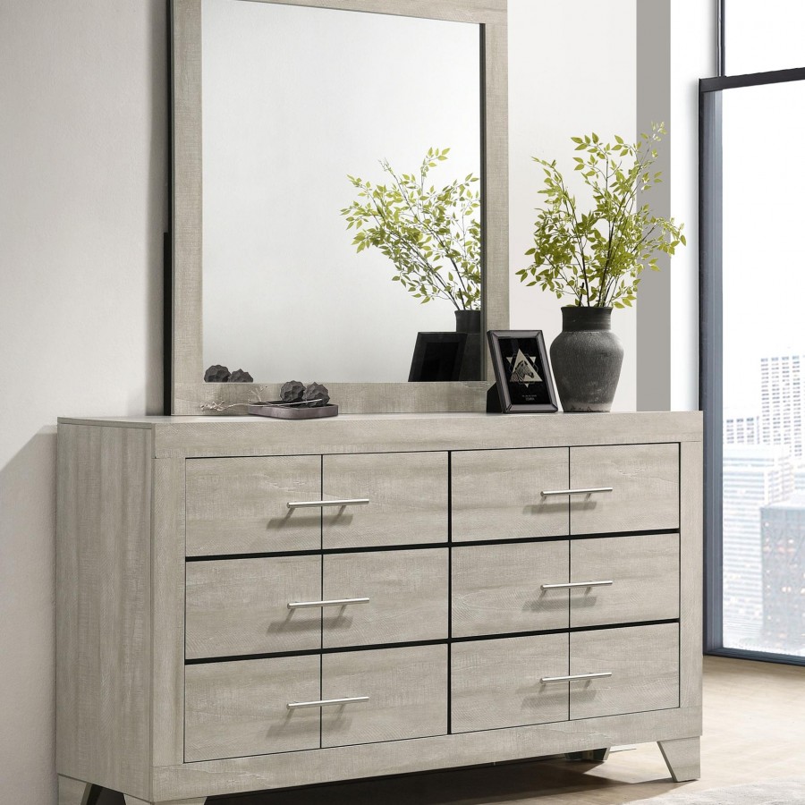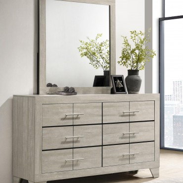 The dresser and mirror set combines sleek, contemporary lines with a touch of rustic charm, making it a standout addition to any bedroom. The dresser, finished in a rustic cream over rough-sawn, white-washed engineered paper veneer, offers six spacious drawers adorned with extra-wide polished nickel handles, adding a modern contrast. The mirror, with a clean-lined frame that complements the dresser, reflects light beautifully to enhance the room's brightness. Built from durable engineered wood with English dovetail joinery and Center metal glides, this set delivers both style and functionality.