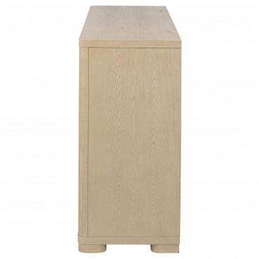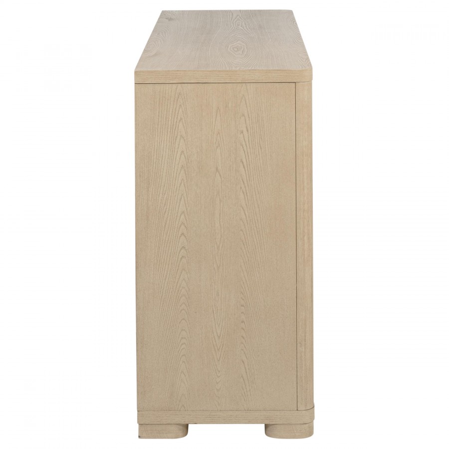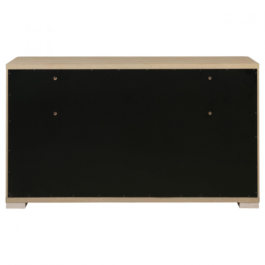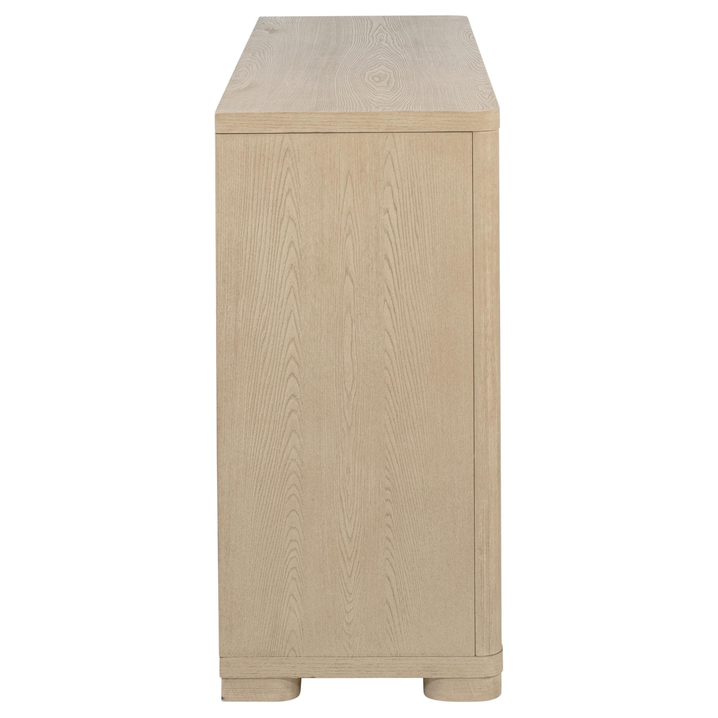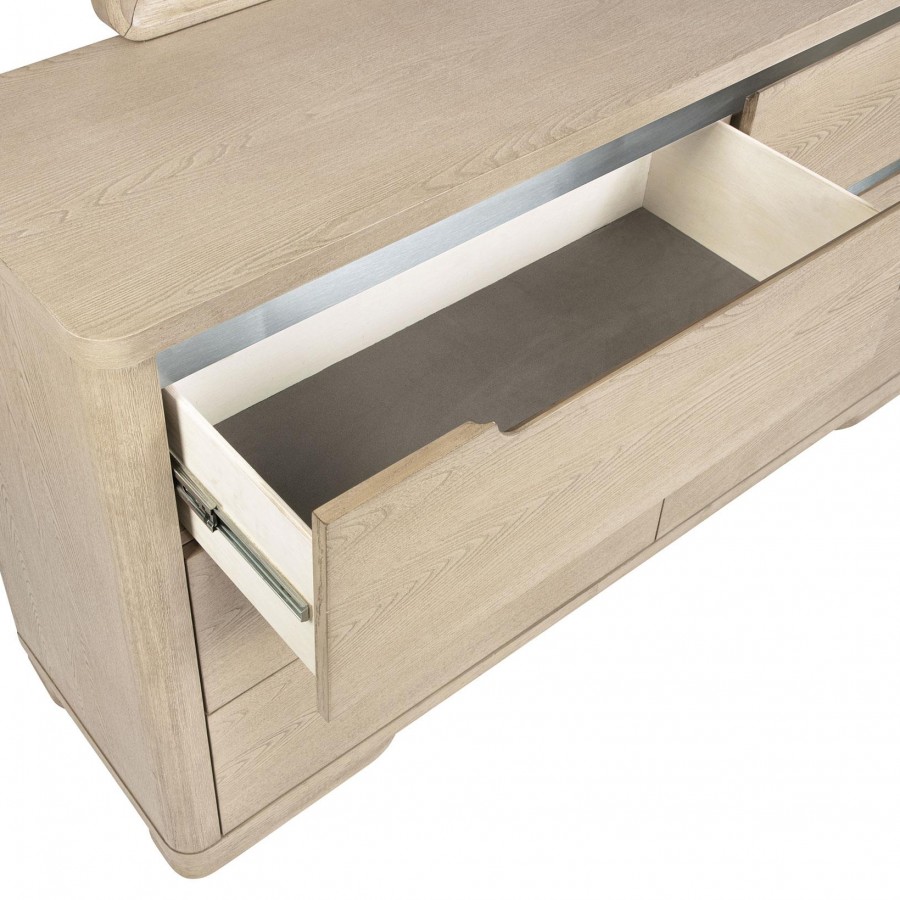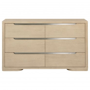 This contemporary six-drawer dresser is designed with clean lines and a light elm finish to complement modern spaces. Brushed nickel fingertip pulls and rounded corners add subtle refinement. The extra-large drawers feature tinted interiors, French dovetail fronts, and English dovetail backs for superior durability. Smooth metal glides ensure reliable performance, making this dresser a stylish and functional addition to any bedroom.
