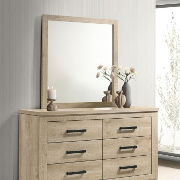 This dresser and mirror set combines rustic charm and modern functionality to elevate your bedroom. The six-drawer dresser features a weathered oak finish and dark bronze handles for a bold, contemporary touch. Crafted from engineered wood with a scratch-resistant veneer, it provides lasting durability. The rectangular mirror, framed in matching weathered oak, reflects light to brighten your space. Together, this set offers a cohesive design and ample storage, blending seamlessly into rustic or transitional interiors.