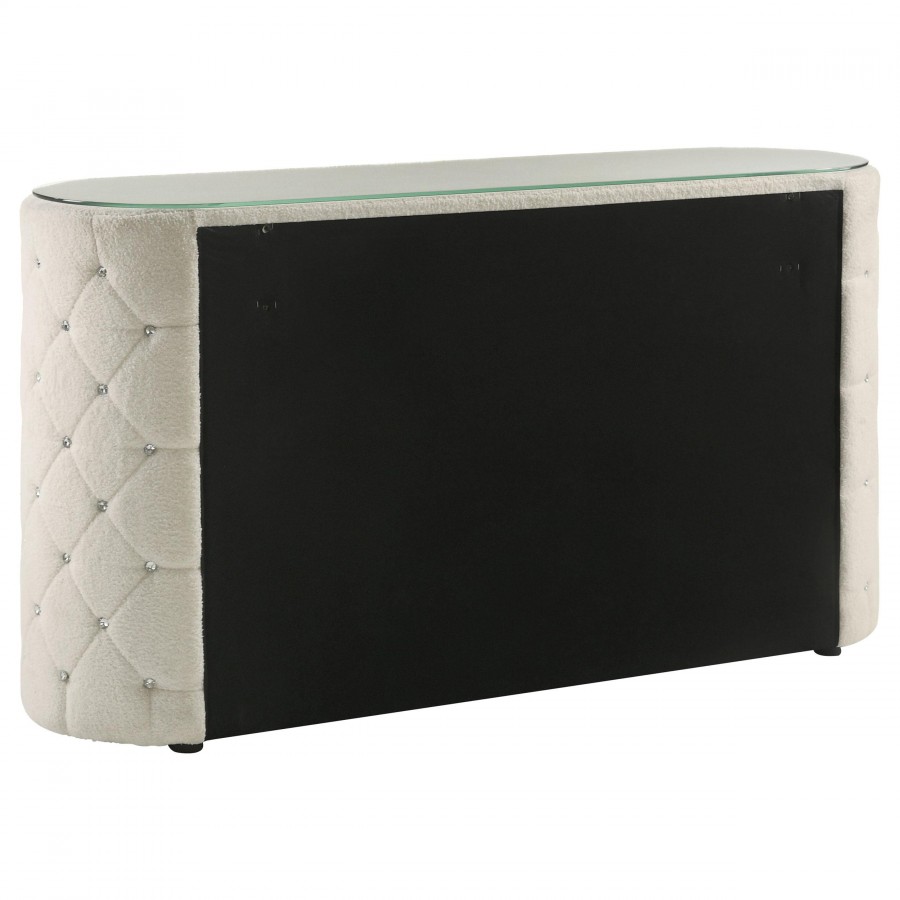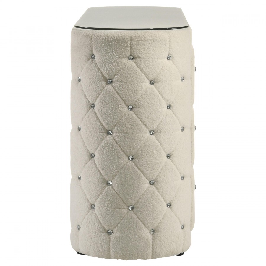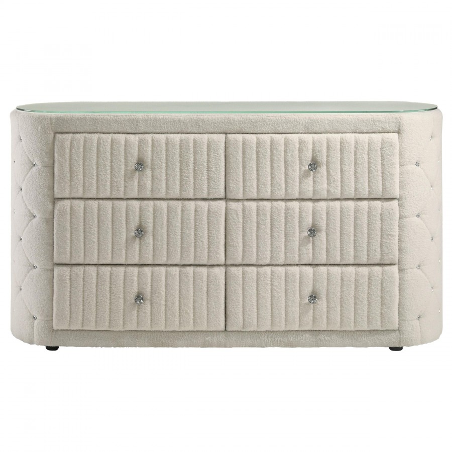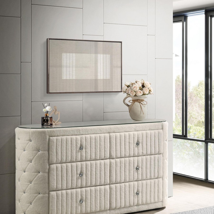 Soft texture meets luminous detail in this statement-making dresser. Wrapped in ivory boucle, the piece features vertical channeling across six spacious drawers, each adorned with crystal-inspired hardware for a hint of sparkle. Diamond tufting along the sides adds depth and dimension, while a clear tempered glass top provides a smooth surface without concealing the luxe upholstery. With its elegant form and functional storage, this dresser elevates everyday routines.