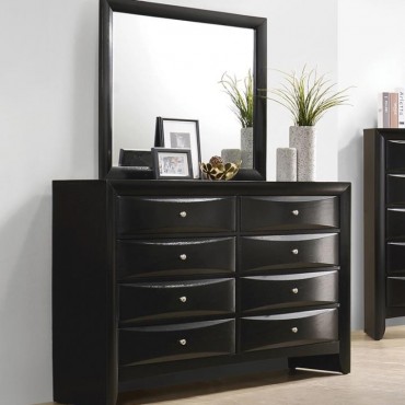 Elevate your bedroom with this elegant eight-drawer dresser, designed for both style and functionality. Finished in a deep black tone, it features chambered drawer fronts that create depth and visual interest, accented by brushed nickel hardware for subtle contrast. Each drawer glides smoothly, offering ample storage for clothing and accessories. Crafted from rubberwood, engineered wood, and okume veneer, this transitional dresser combines durability and refined design to complement a modern or classic bedroom.