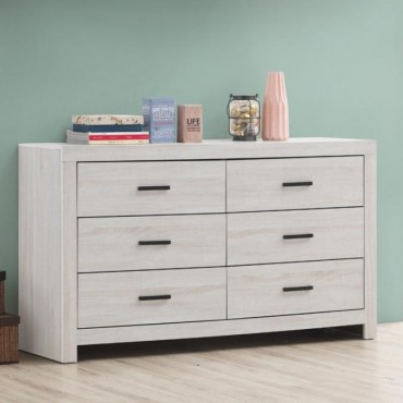 This six-drawer dresser offers a perfect balance of style and storage. Its clean-lined frame complements modern and contemporary spaces, while six spacious drawers provide ample room for clothing and accessories. Crafted from engineered wood with a durable laminate veneer, this dresser is built for everyday use. Matte dark bronze handles add a refined contrast, enhancing its sleek and functional design.