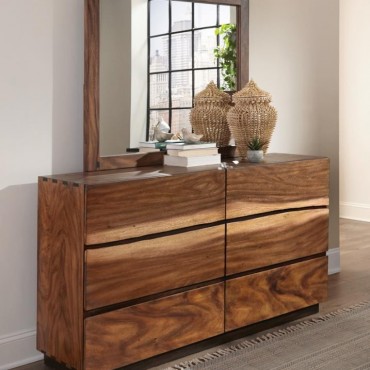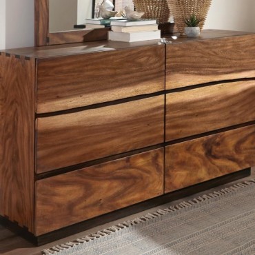 Add a striking, creative touch to a master bedroom. With eye-catching wood patterns and natural accents, this dresser really stands out. Its smokey walnut and coffee bean finish are enhanced by artsy, faded wood accents. Six spacious drawers allow ample storage options to keep your space organized. Pair it with a matching mirror to bring glamour and ease to your morning routine.