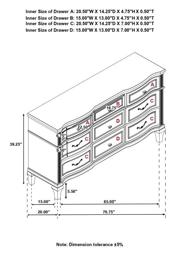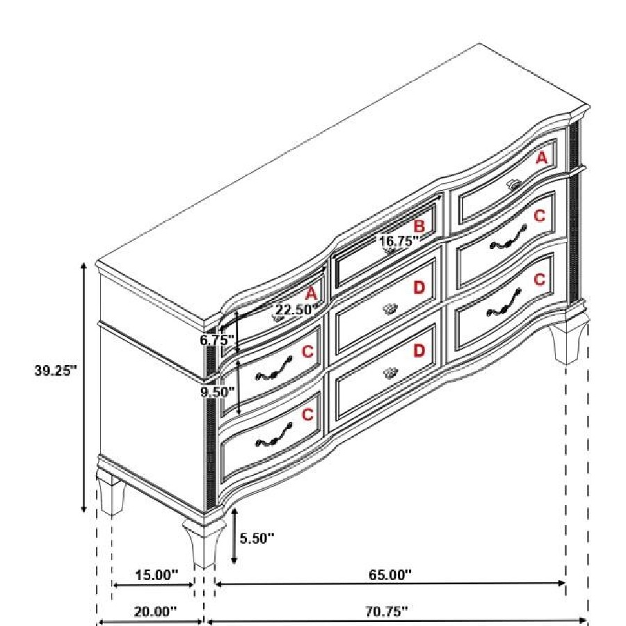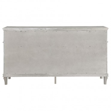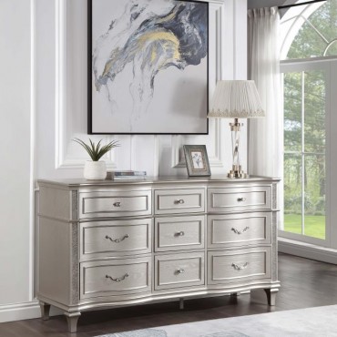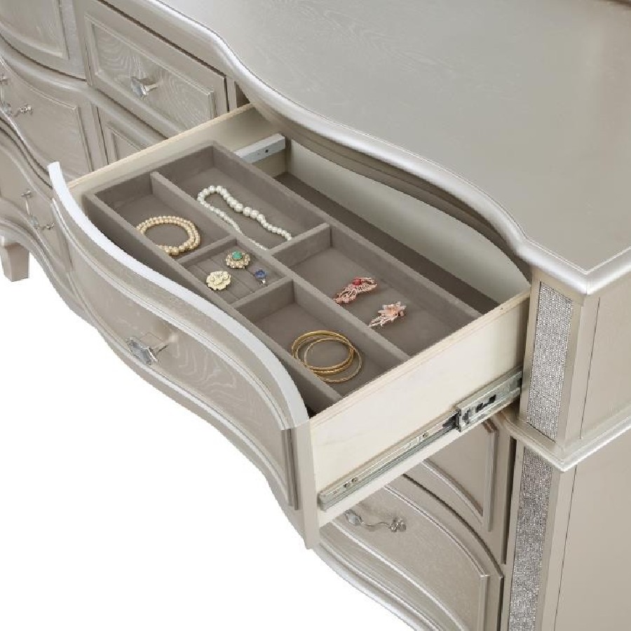 A silver oak finish creates an elegant touch to this glam nine-drawer dresser. Hexagon-shaped knobs and drop bail handles appointed with pearl accents adorn each of the nine spacious drawers for a luxurious look and feel. Keep delicate essentials organized within the grey felt-lined top drawers and garments in the deep bottom drawers. Across the dresser front is a curved facade that sweeps through the drawer fronts and ends at two sparkling column panels. Charming wood molding details along the top and bottom, along with intricate trim, offer a classical flair.