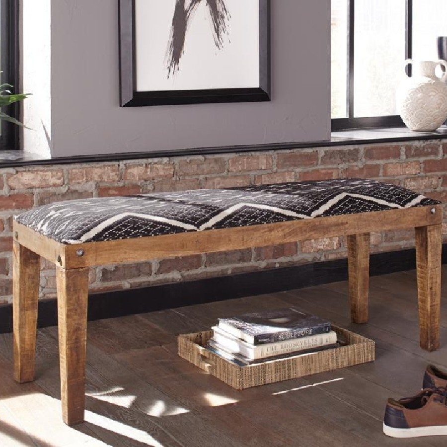 Elevate your space with this modern rustic bench, blending natural wood tones with bohemian-inspired upholstery. The solid mango wood frame showcases a rich, exposed grain, accented by decorative nailhead details for added charm. A bold black-and-white geometric fabric upholsters the plush cushioned seat, creating a striking contrast. With clean lines and subtly tapered legs, this versatile accent bench is perfect for entryways, bedrooms, or additional seating in any space.