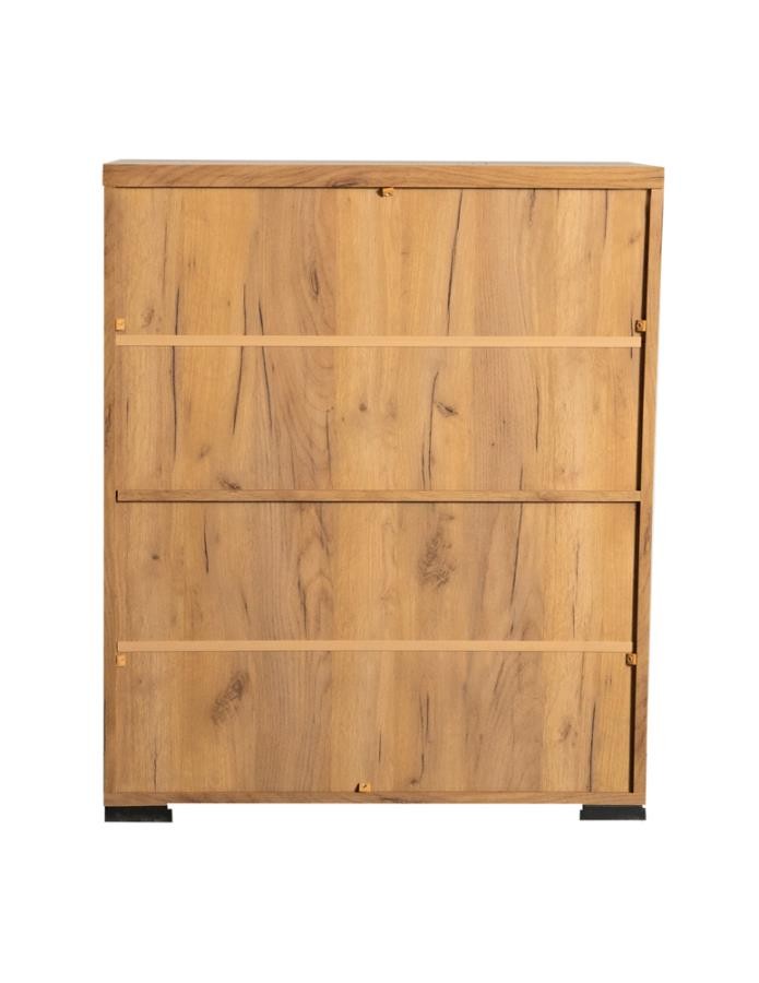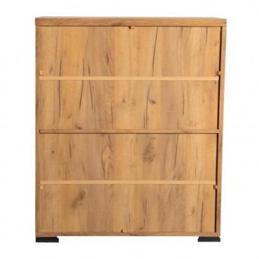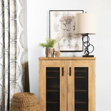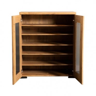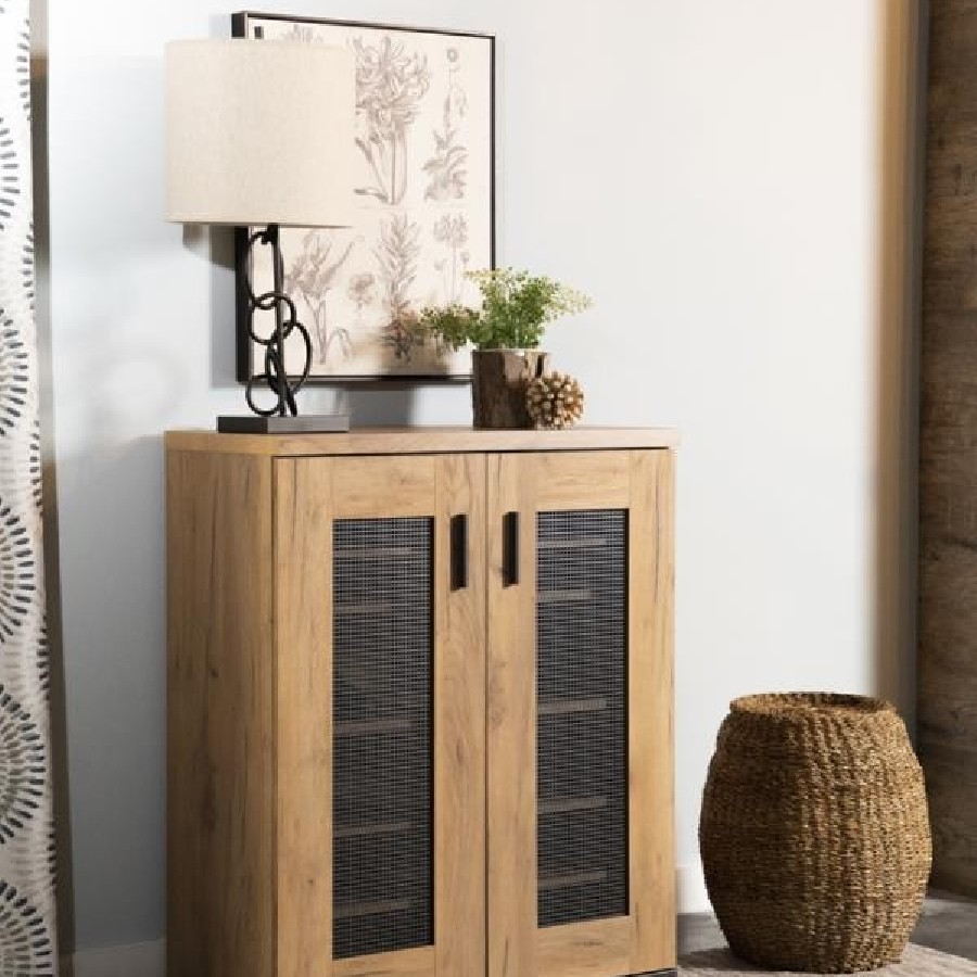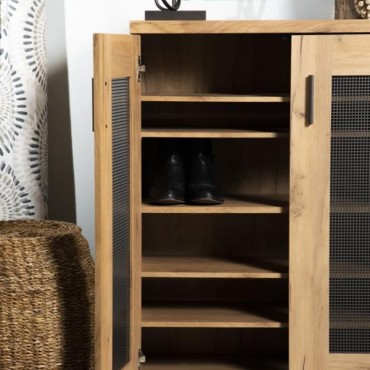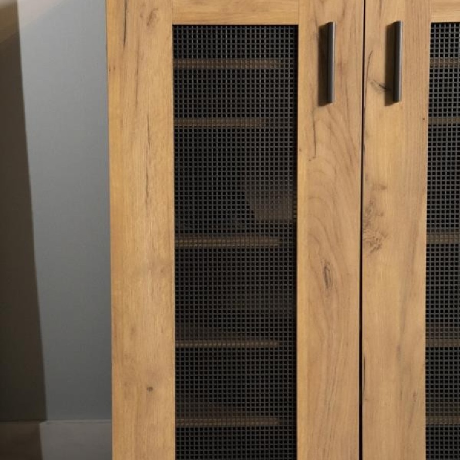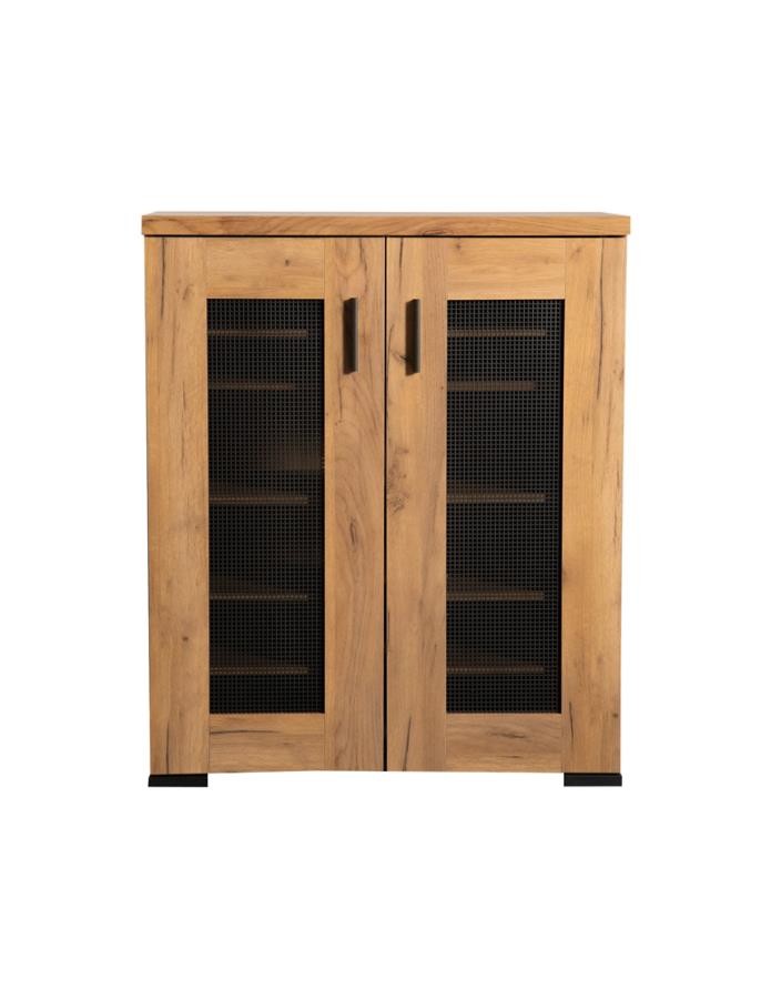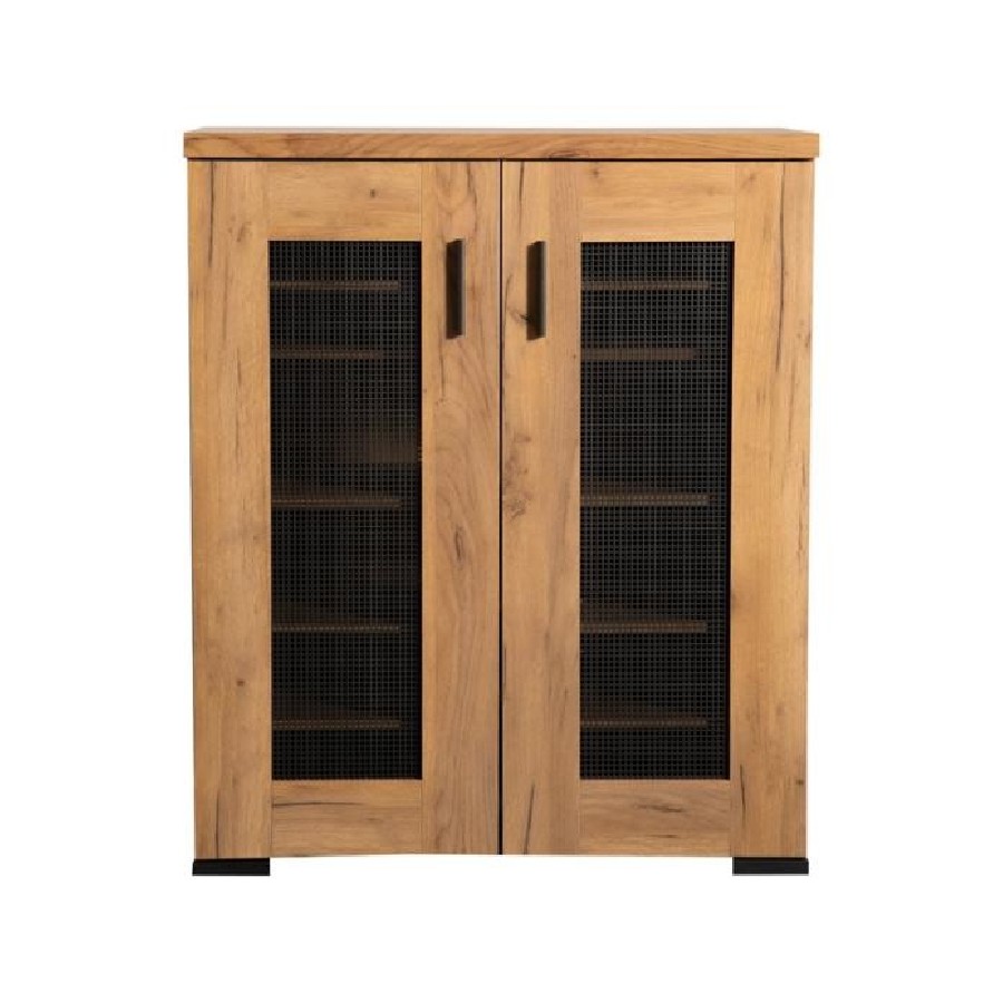 This shoe cabinet blends functional storage with a warm, rustic aesthetic. Crafted from engineered wood with a golden oak wood-look laminate veneer, it offers a natural texture that complements a variety of interiors. The double doors feature mesh-style inserts and modern black handles for a subtle industrial accent. Inside, seven shelves provide generous room for organizing shoes, making this piece ideal for keeping entryways or closets neat and accessible.