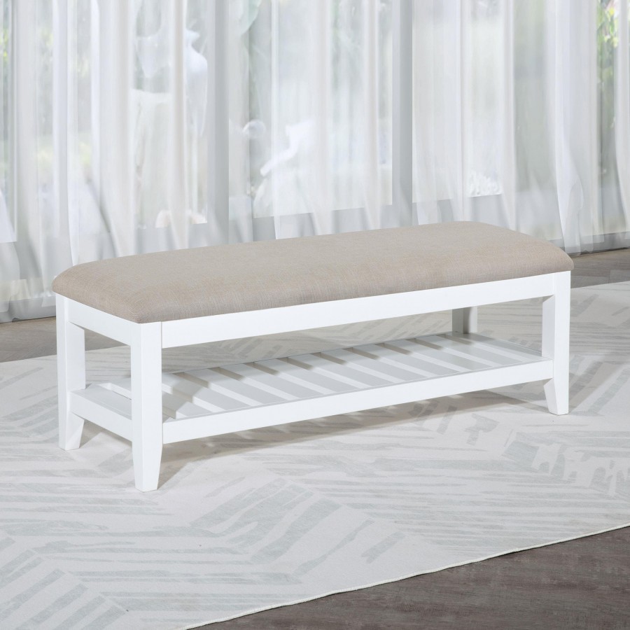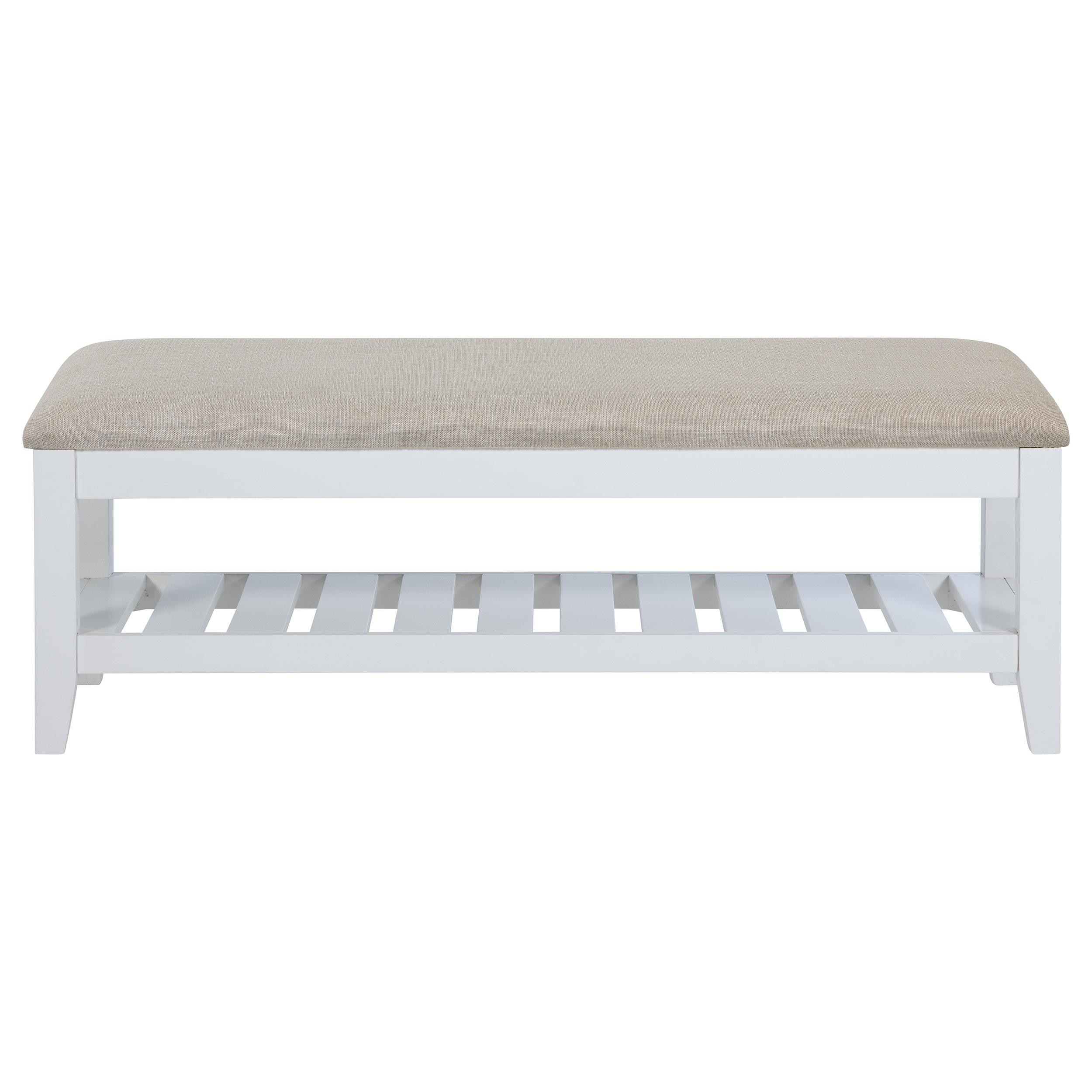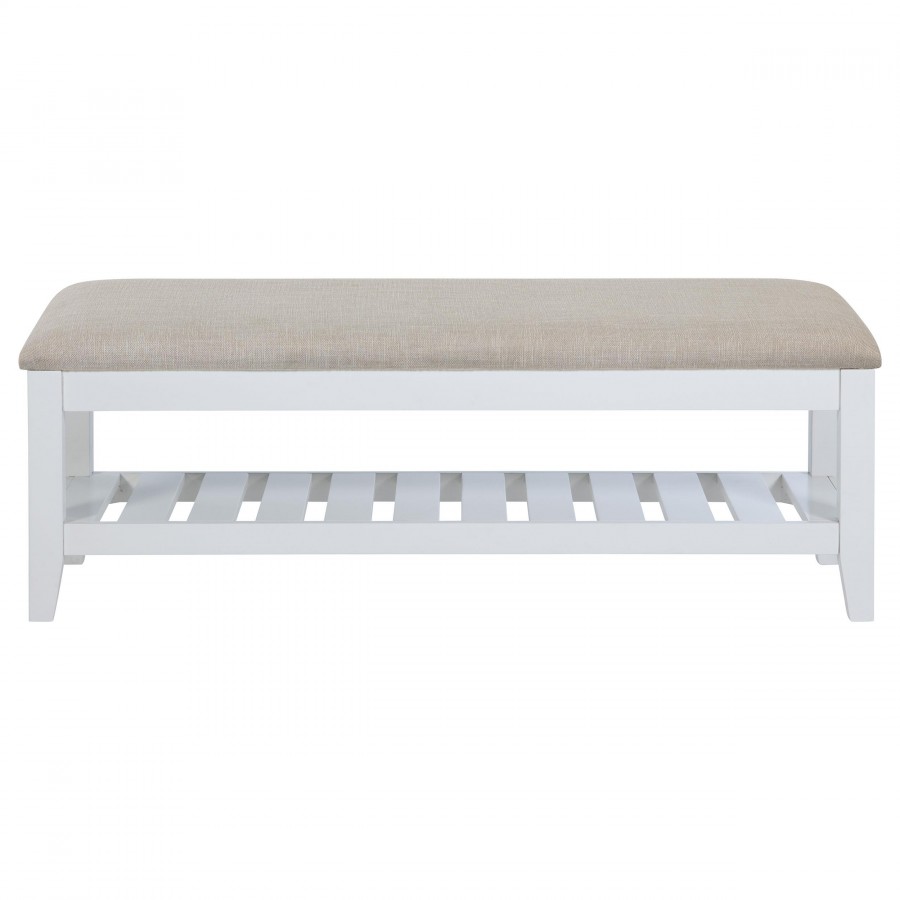 This sleek and versatile bench brings a touch of timeless elegance to any room. Its beige upholstered, foam-padded seat offers exceptional comfort while the sturdy wooden frame, finished in white, ensures long-lasting durability. A slatted shelf beneath the seat provides practical storage for shoes or other essentials, making it perfect for entryways or bedrooms. The clean lines and simple design make it a fitting addition to both modern and classic interiors. Its thoughtful construction delivers both functionality and an understated, stylish charm.