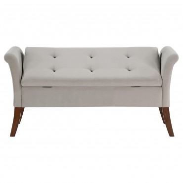 Elevate your living space with a harmonious blend of luxury and utility found in this exquisite storage bench. Adorned with a plush velvet upholstery, it boasts flared arms and meticulous button-tufting, reflecting a dedication to design and attention to detail. Complementing its lush fabric, the bench sits atop elegant wooden legs, lending a touch of timeless elegance. Beyond its aesthetic appeal, this piece is not just about style; it offers a generous storage solution, marrying beauty with practicality. Perfect for homes that appreciate sophistication and functionality in equal measure, this upholstered storage bench stands as both an iconic piece of furniture and a testament to refined taste.