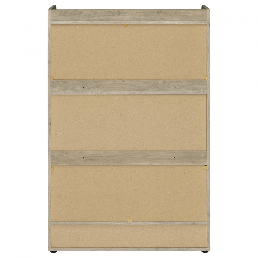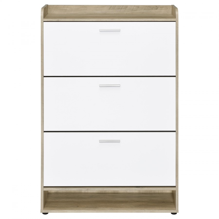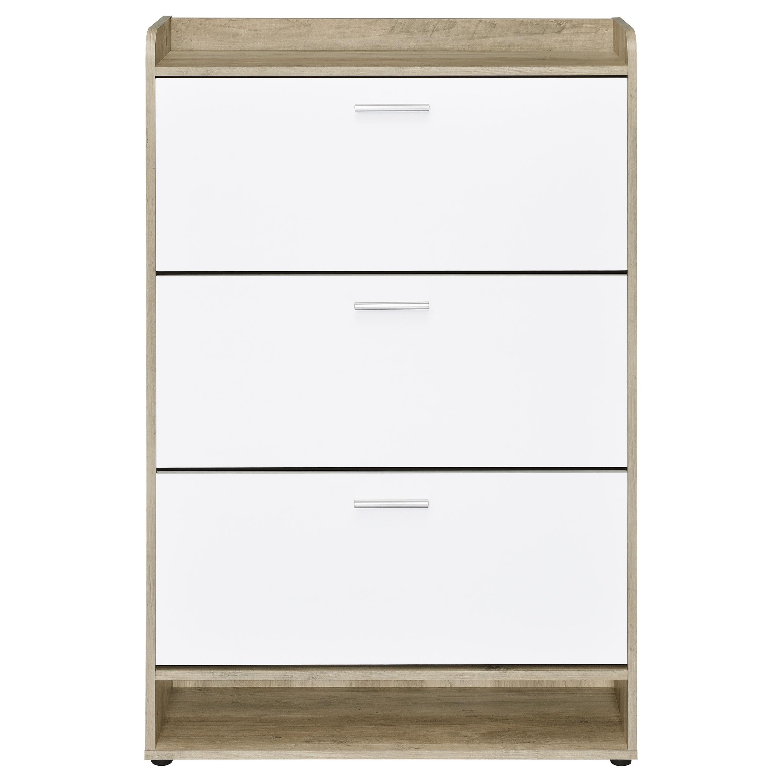 Elevate the organization of your entryway with our dual-tone shoe cabinet, a harmonious blend of practicality and contemporary design. This chic cabinet, crafted from robust engineered wood with a realistic wood-look laminate, offers three tiers of shelving for your footwear, each promising to keep your space clutter-free. The sleek top serves as a perfect perch for your decorative touches or daily essentials, while an additional compartment at the base discreetly takes care of extra storage needs. This cabinet seamlessly adapts to your home's aesthetic, ensuring style and function walk hand in hand.