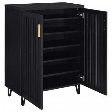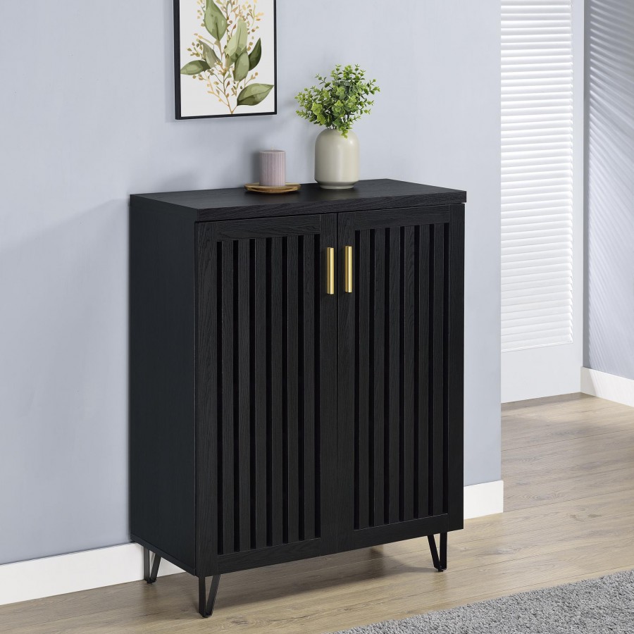 Transform your foyer or hallway with this versatile shoe cabinet, designed to keep your footwear organized and out of sight while complementing a variety of interior styles. Behind its distinctive vertical-slatted doors, multiple adjustable shelves provide ample room for everything from everyday sneakers to formal footwear. Crafted from engineered wood with a durable laminate veneer, it rests on slender metal legs, creating a balanced silhouette that enhances both form and function.