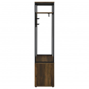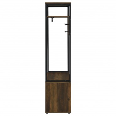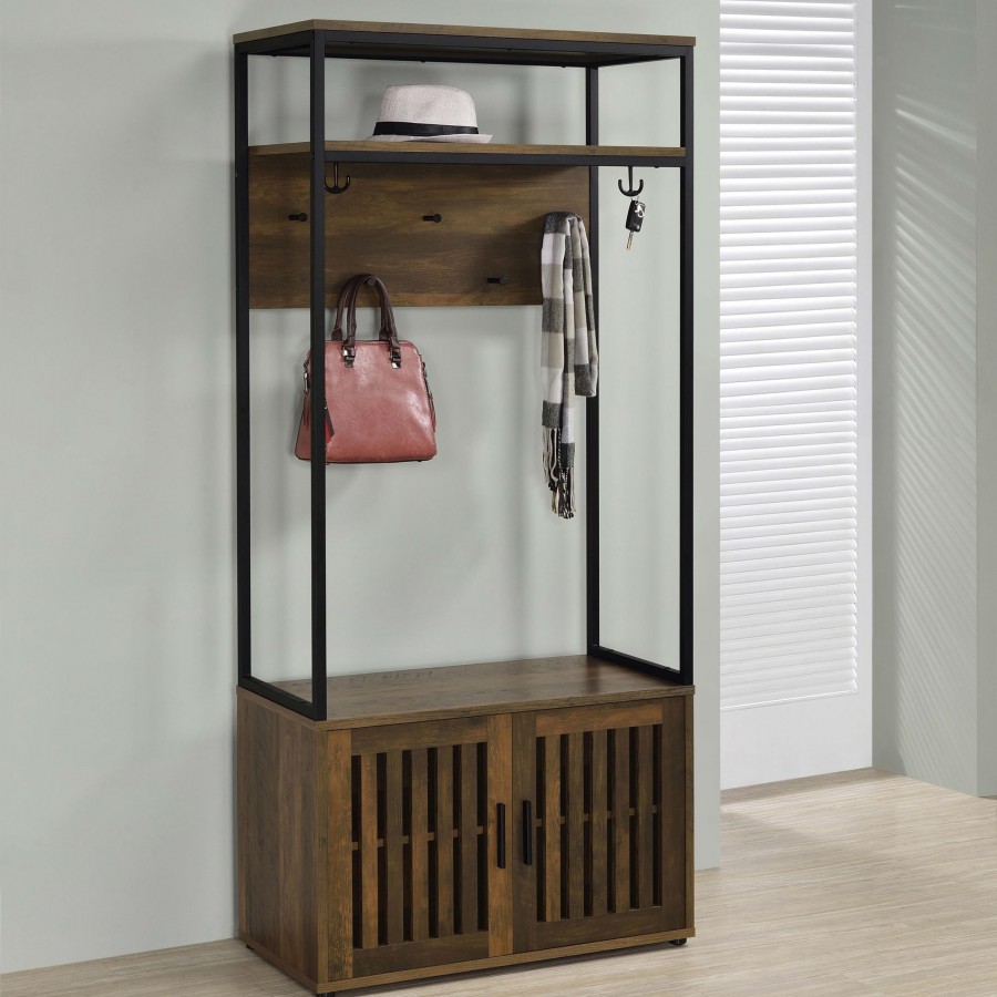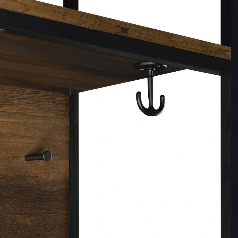 Your functional living space keeps clutter away with a rustic hall tree offering ample room for storage. Perfect for a transitional entryway or mud room, this hall tree features a lower cabinet and upper board made of rich dark pine finish wood products. Industrial inspiration adds black finish metal framing in a linear mode, adding an upper shelf for storage and a tray surface above its cabinet. Find four shelves behind two cabinet doors, ideal for concealing shoes and accessories. Hang coats, hats, and scarves on seven hooks, making them accessible with a quick reach.
