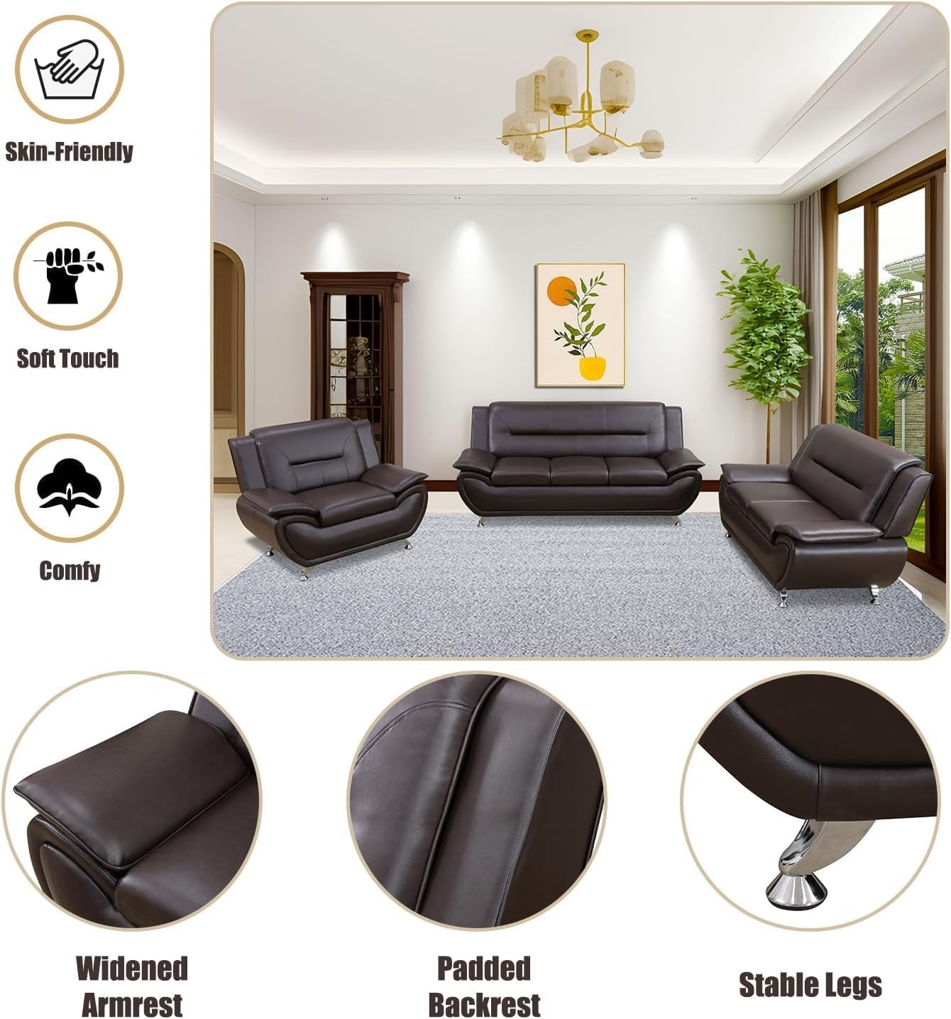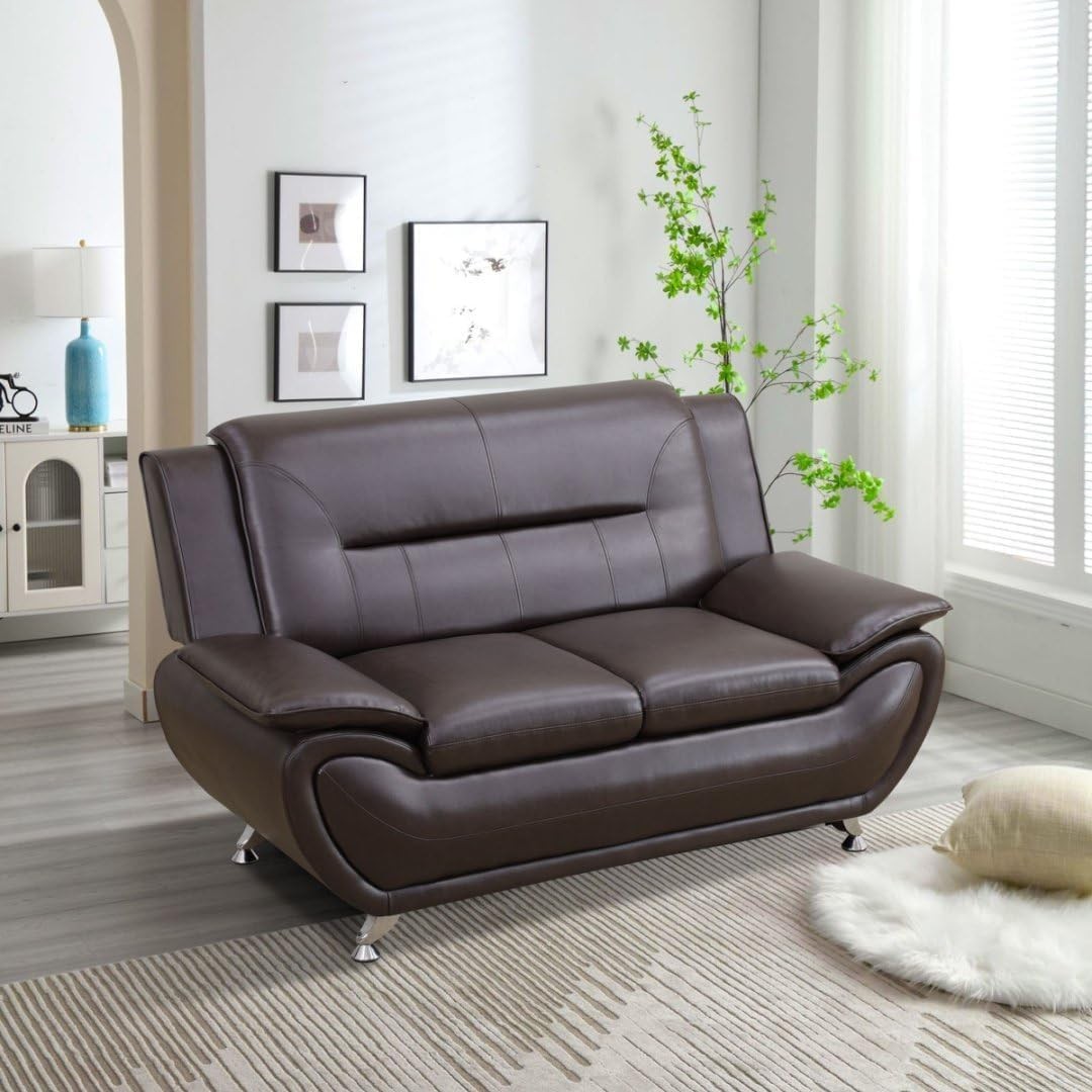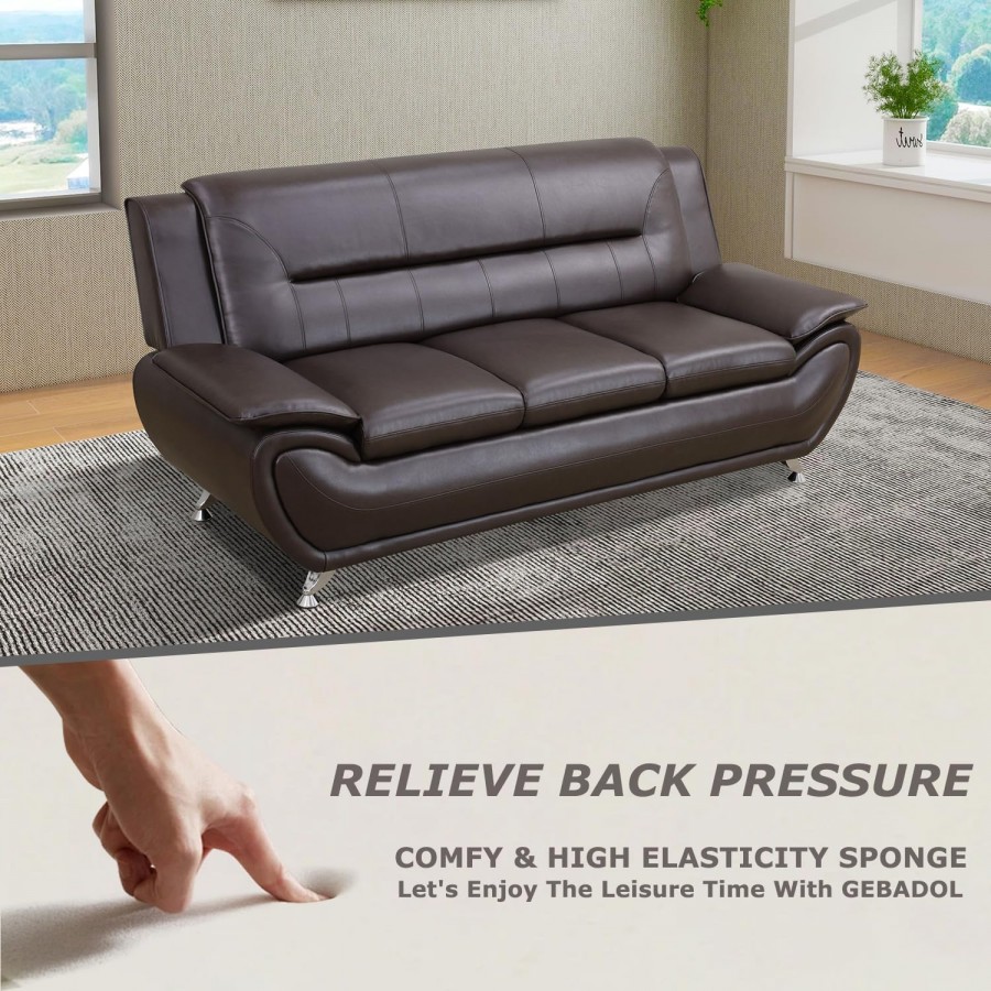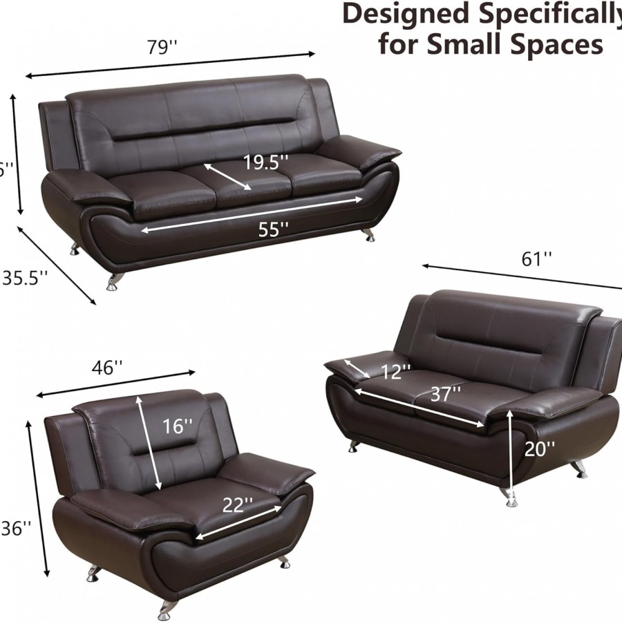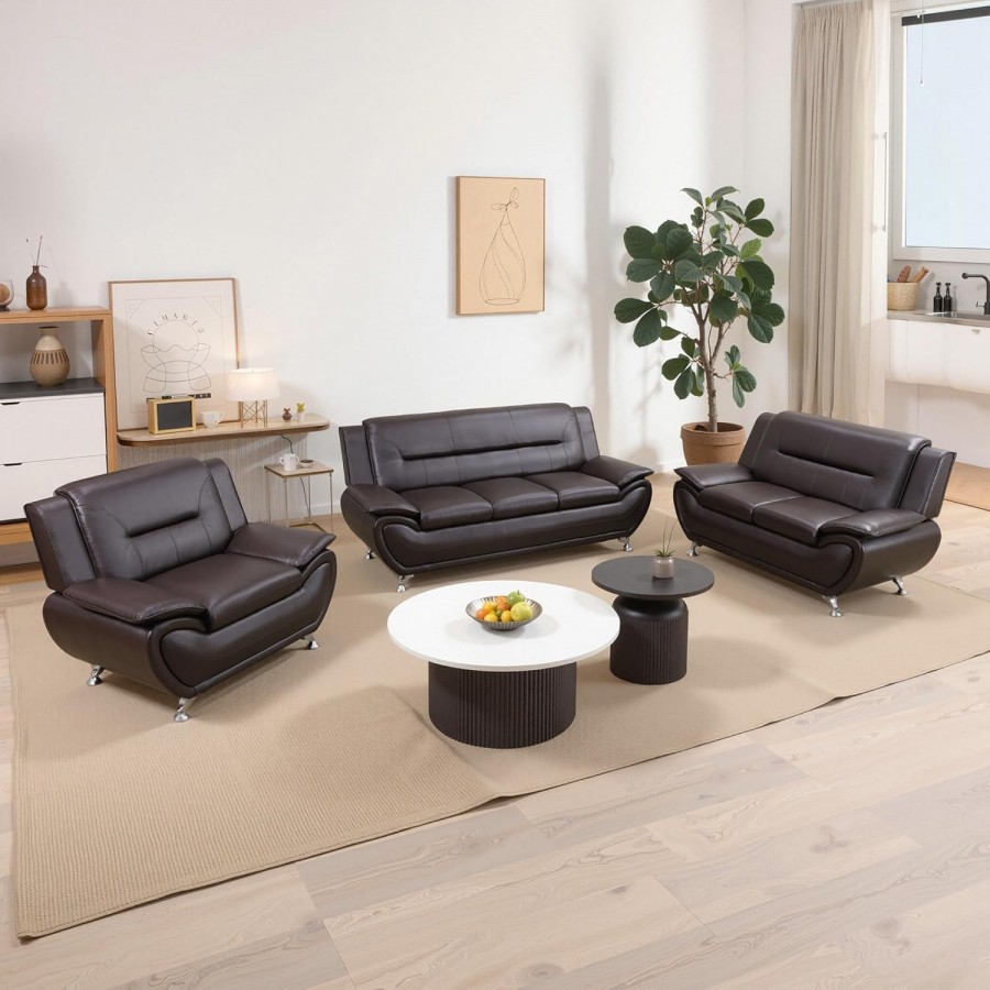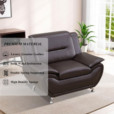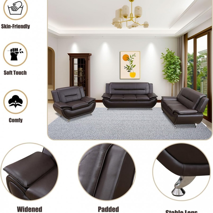 3PC Bonded Leather Living Room Set, Modern Brown Couch Set for Living Room/Apartment/Office