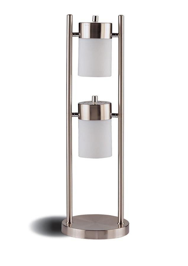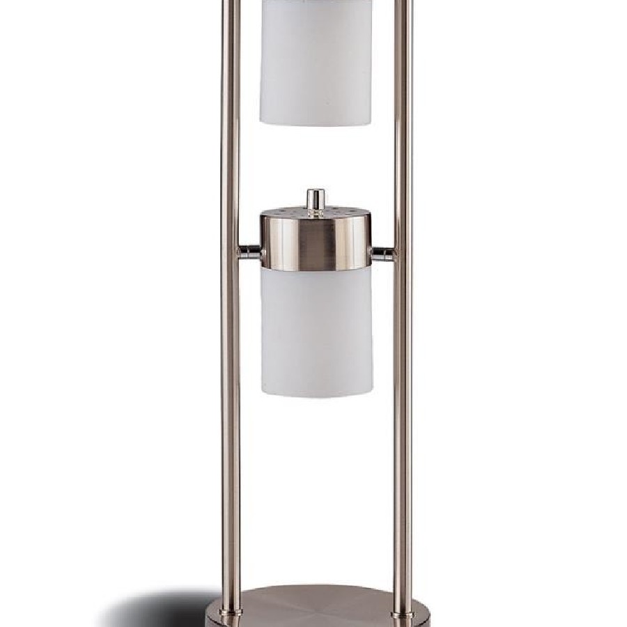 Contemporary verve with a gorgeous mix of materials and finishes. Enjoy a classic, sophisticated ambiance in this table lamp. Designed to impress, its two-tier arrangement of swivel lamps plays on a linear model and deliver twice the lighting. A brushed silver base and frame blend beautifully with frosted cylinder and plastic shades. Operates with a handy on off switch.