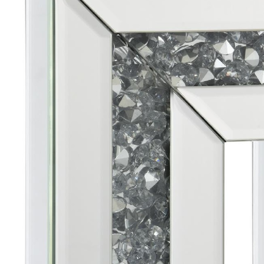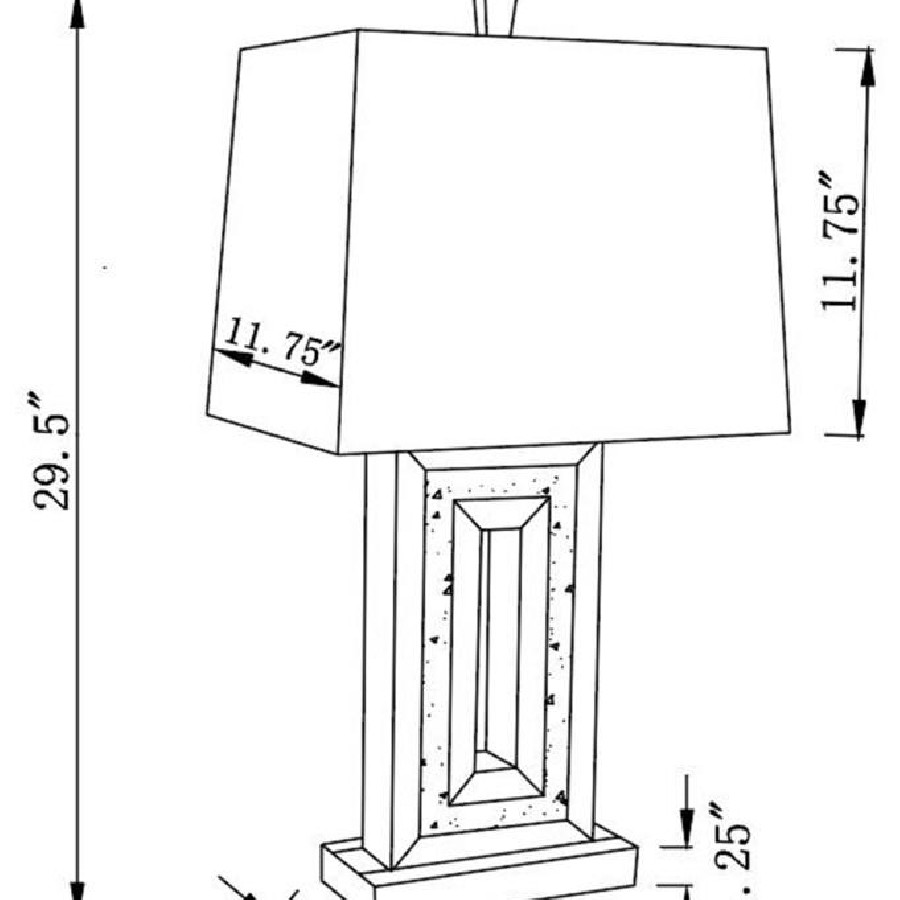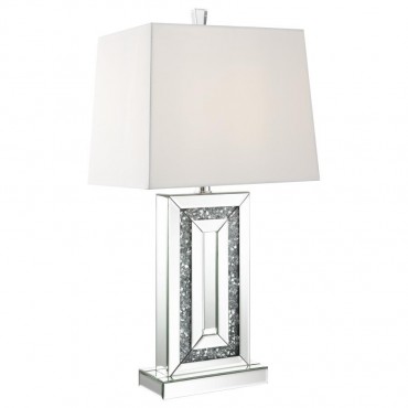 This modern table lamp features a rectangular base framed with beveled mirrored panels and sparkling crushed acrylic crystal inlay. Its geometric design delivers bold symmetry and a touch of glamour, anchored by a crisp white shade that softens the light. The reflective surfaces and shimmering textures create an eye-catching centerpiece ideal for bedrooms, entryways, or living room consoles that need both illumination and visual impact.
