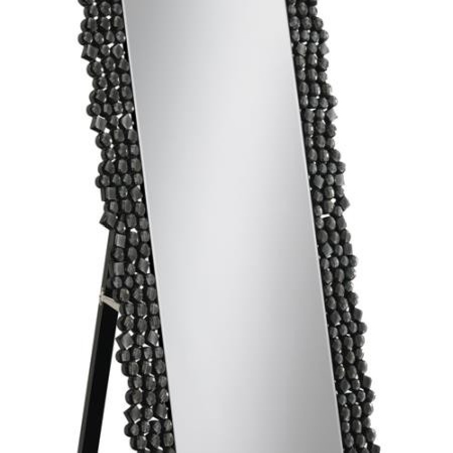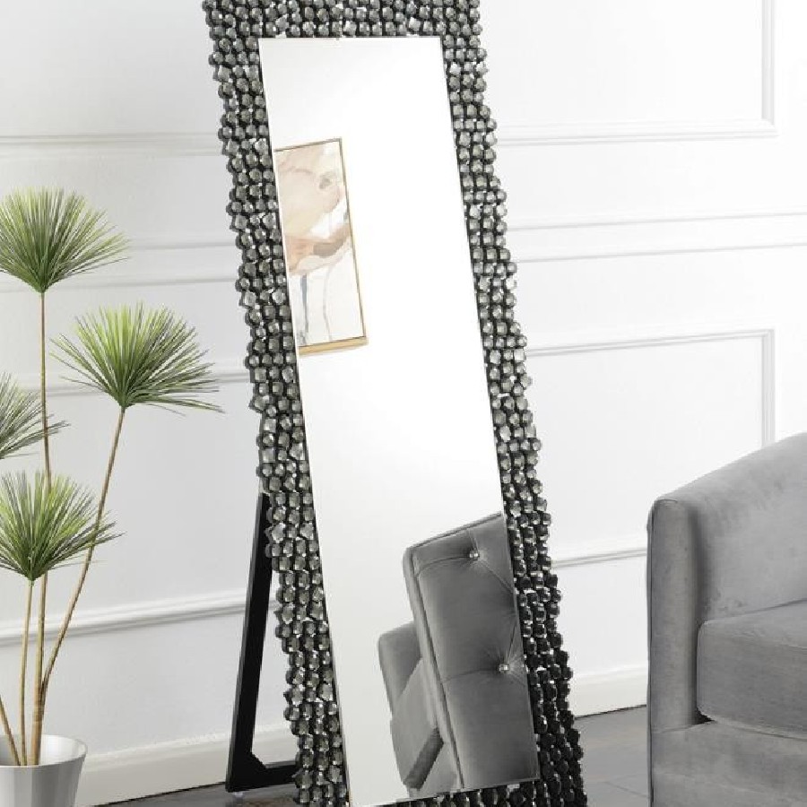 This standing mirror brings bold dimension and sparkle with its dramatic frame of faceted acrylic crystals. Designed to stand freely with an integrated easel back, it delivers a full-length view while doubling as a decorative statement. The crystal-like accents reflect light at every angle, enhancing the mirror’s dynamic presence. Ideal for bedrooms, dressing areas, or boutique spaces, this floor mirror blends glamour with function in one sleek silhouette.
