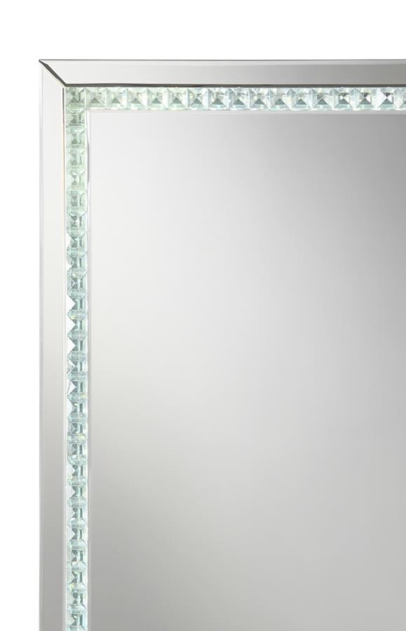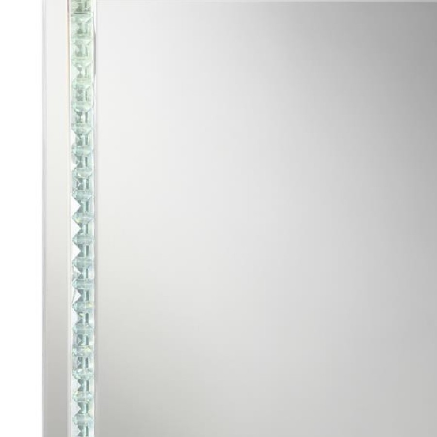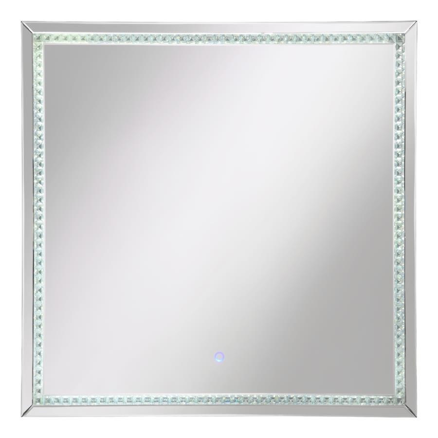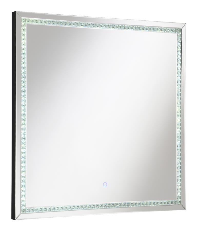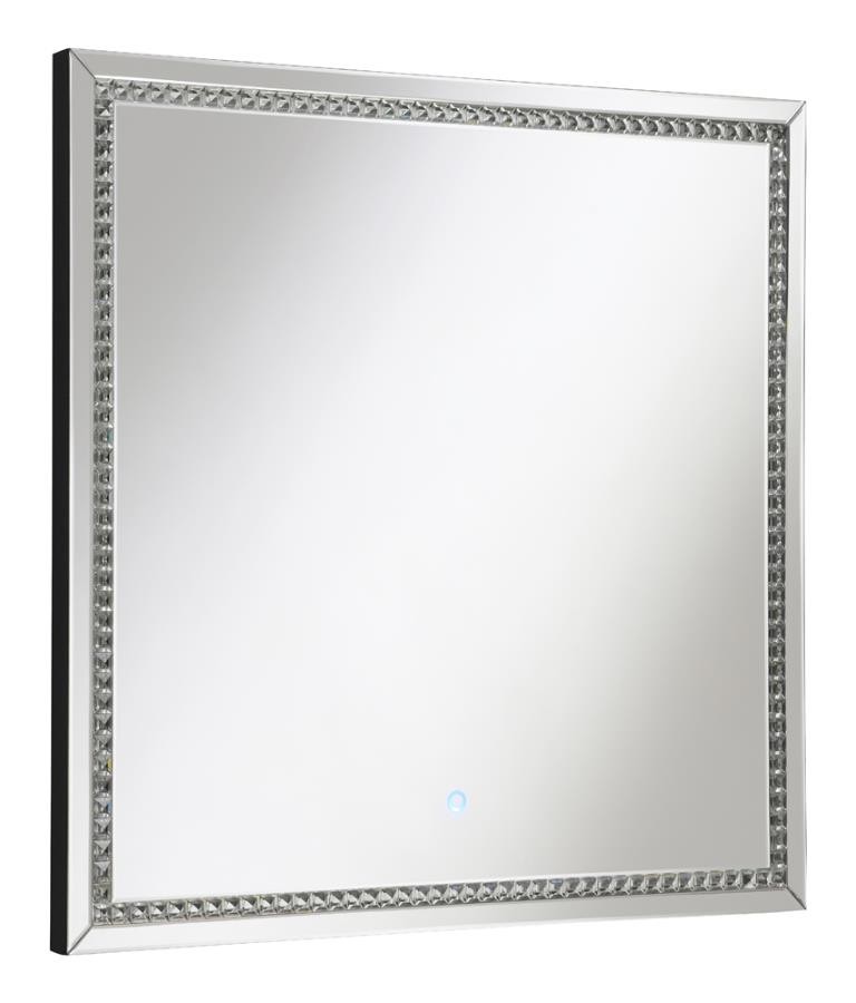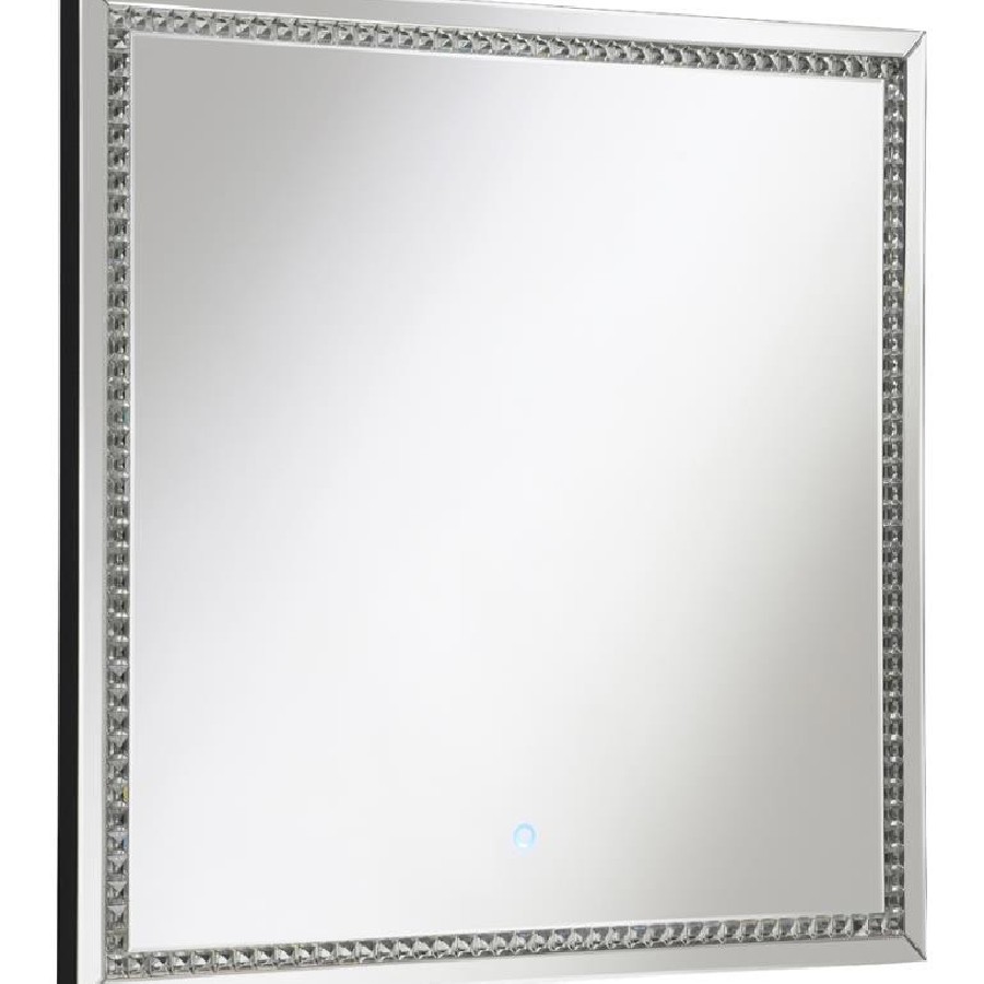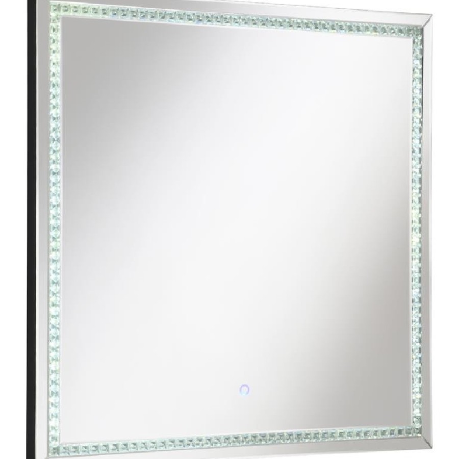 Transform your chic vanity setup or entryway foyer with this modern glam mirror. A squared frame offers a lovely addition that hangs elegantly over bathroom countertops, bedroom dressers and so much more, inviting you to check yourself before heading out. Slim mirror tile creates an extra dimension of reflection for a sleek duality. A center trim of glimmering glass crystal tile aligns the interior edge, offering a diamond-inspired luxe touch and hint of texture. A built-in LED strip light illuminates the glass crystal tile, transforming this contemporary mirror into a clever ultra-modern statement piece.