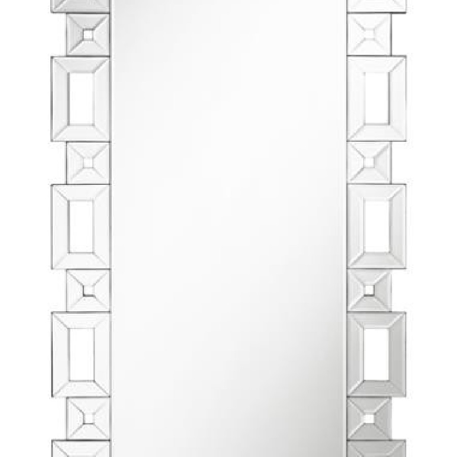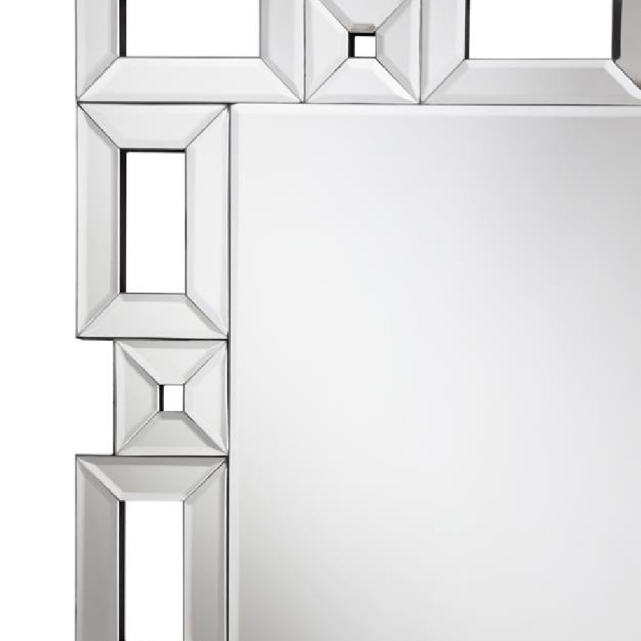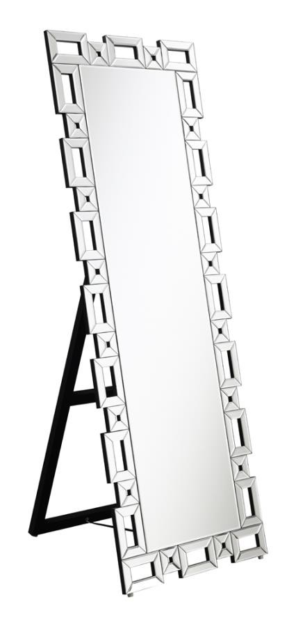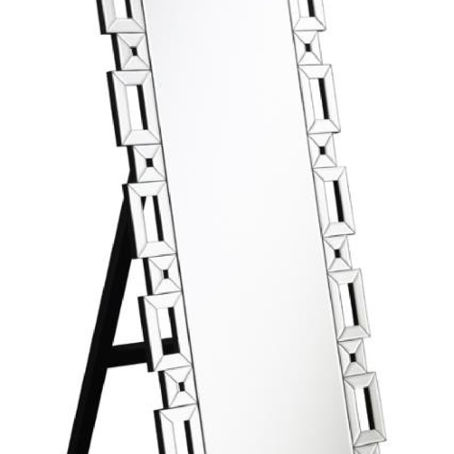 Check your fashionable ensemble with this charming, modern glam cheval mirror. A sophisticated frame of open rectangles and squares surrounds the main mirror, lending a Greek key-inspired silhouette for a classical aesthetic. Each sleek, boxy shape is covered in a mirror trim tile designed with a subtle bevel edge for a hint of texture and extra dimension. A rear kickstand leans the cheval mirror backward ever so slightly, allowing you to see your whole look before stepping out for dates and workdays. Place this elegant cheval mirror in your bedroom to create an instant dressing area.