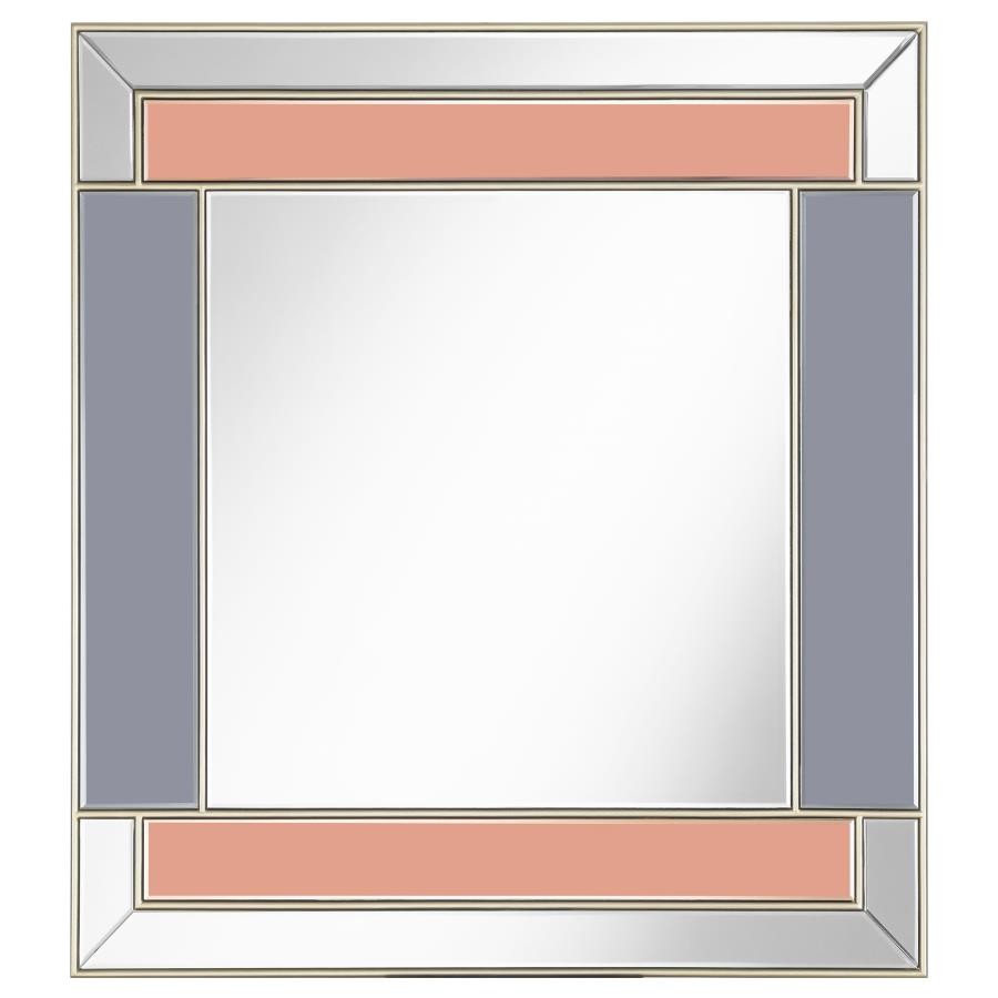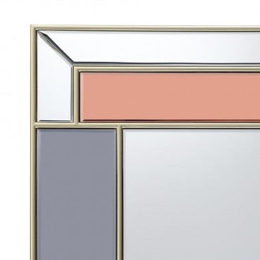 With a two-tone design, this rectangular wall mirror is sure to be noticed. Lending an Art Deco flair exhibited in staggered lines and vintage-inspired warm accents, this glamorous yet contemporary wall mirror offers a dramatic touch. Stainless steel trim outlines the silhouette of the mirror along with the edges of each mirror tile. With champagne mirror tile accents flanking the edges and a beveled outer frame, this mirror rests boldly inside a foyer or above a fireplace mantel. With classic elements and subtle retro vibes, this accent piece will leave an impression.