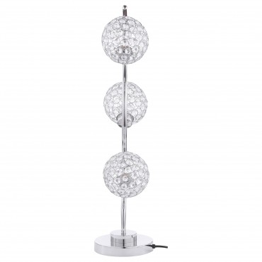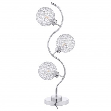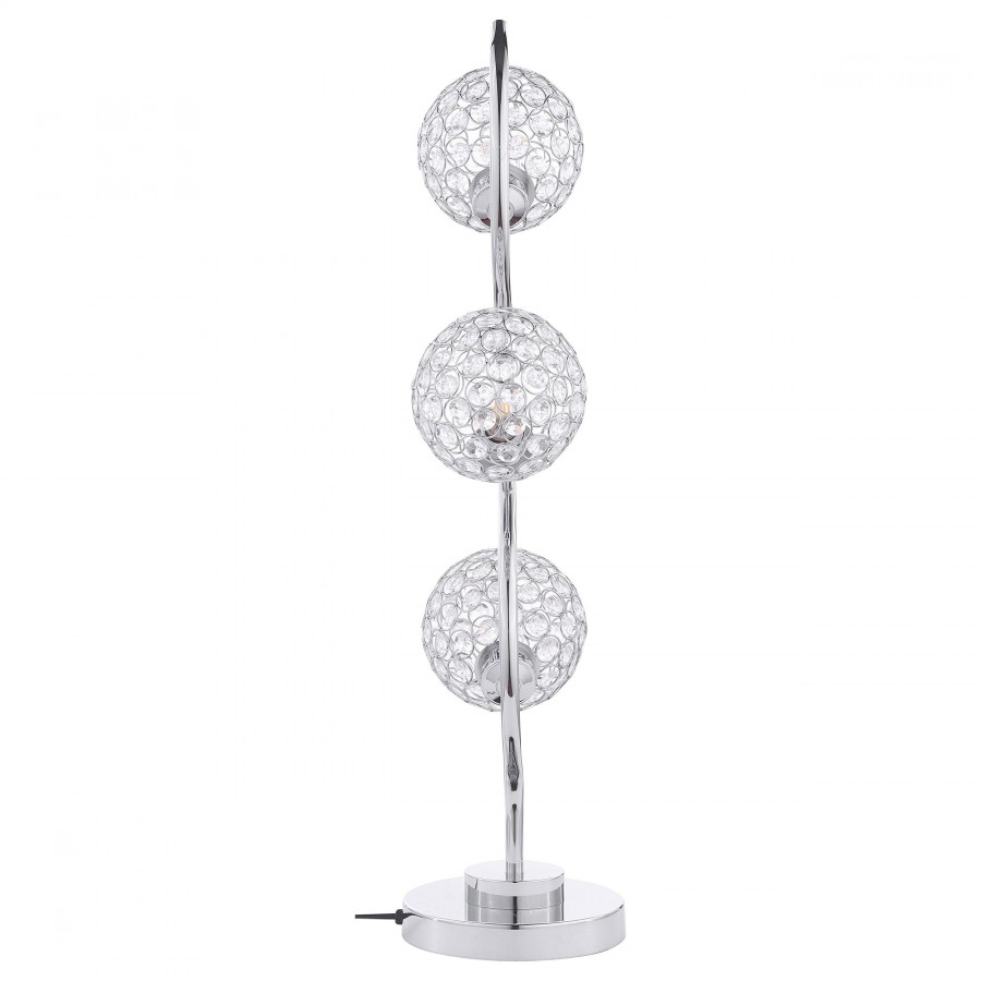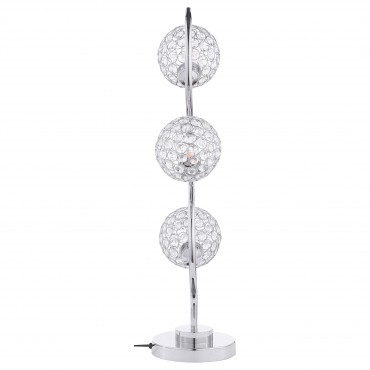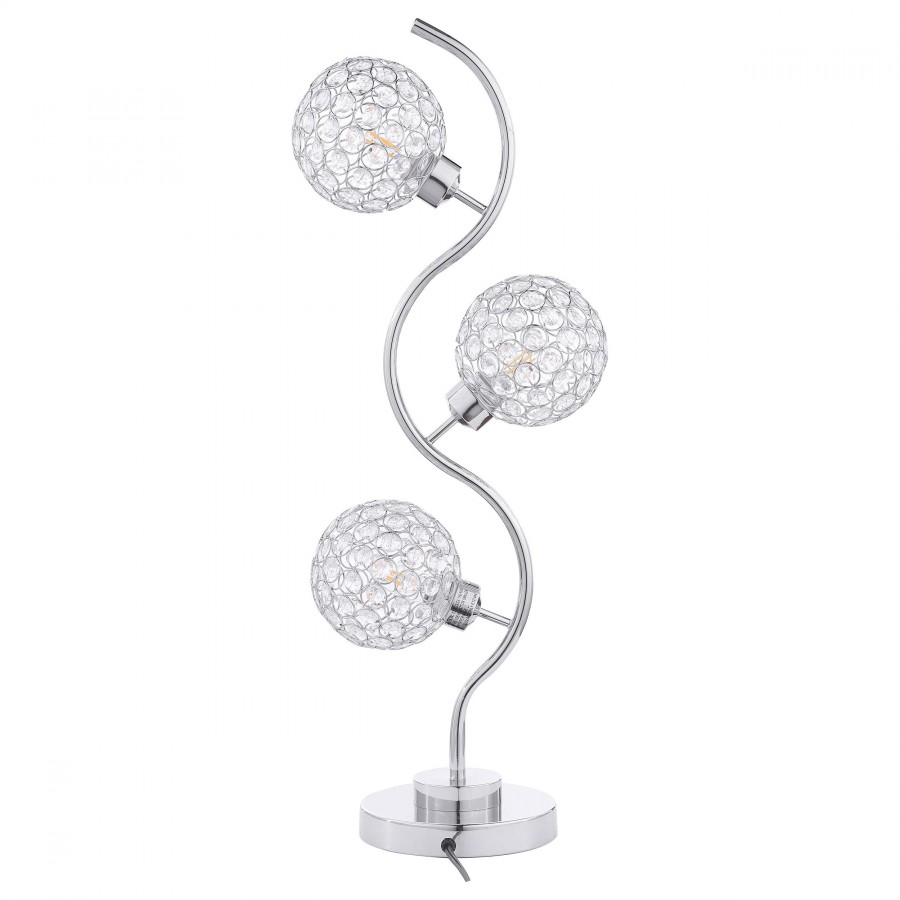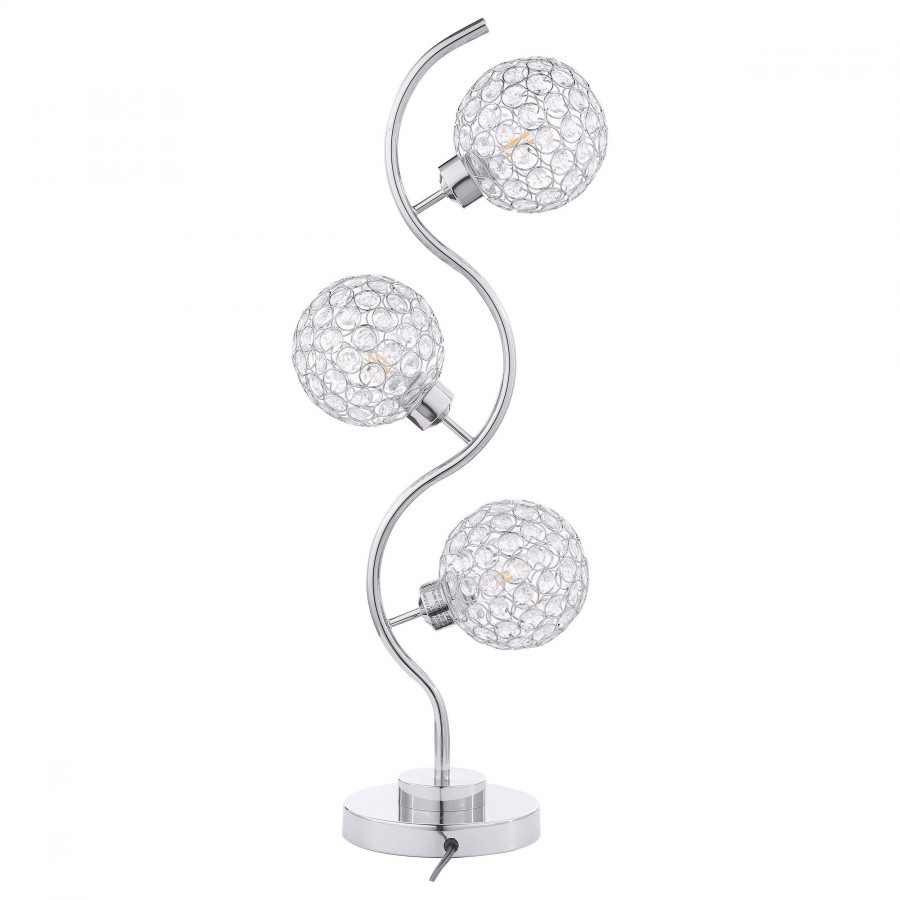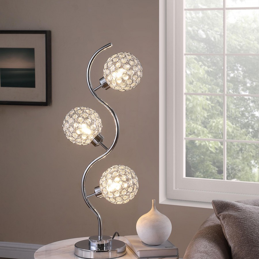 Sparkling with glamour, this modern three-light table lamp is a superb choice for a sophisticated living space. A corkscrew inspired post gleams in a chrome finish and hosts its three lights. Each features an orb shade dotted with crystal-like embellishments that glitter in the light. Three LED bulbs use just 4 watts of power each, creating a lamp that's both stylish and energy efficient. It operates with a touch switch, perfect for easily turning it on in the dark.