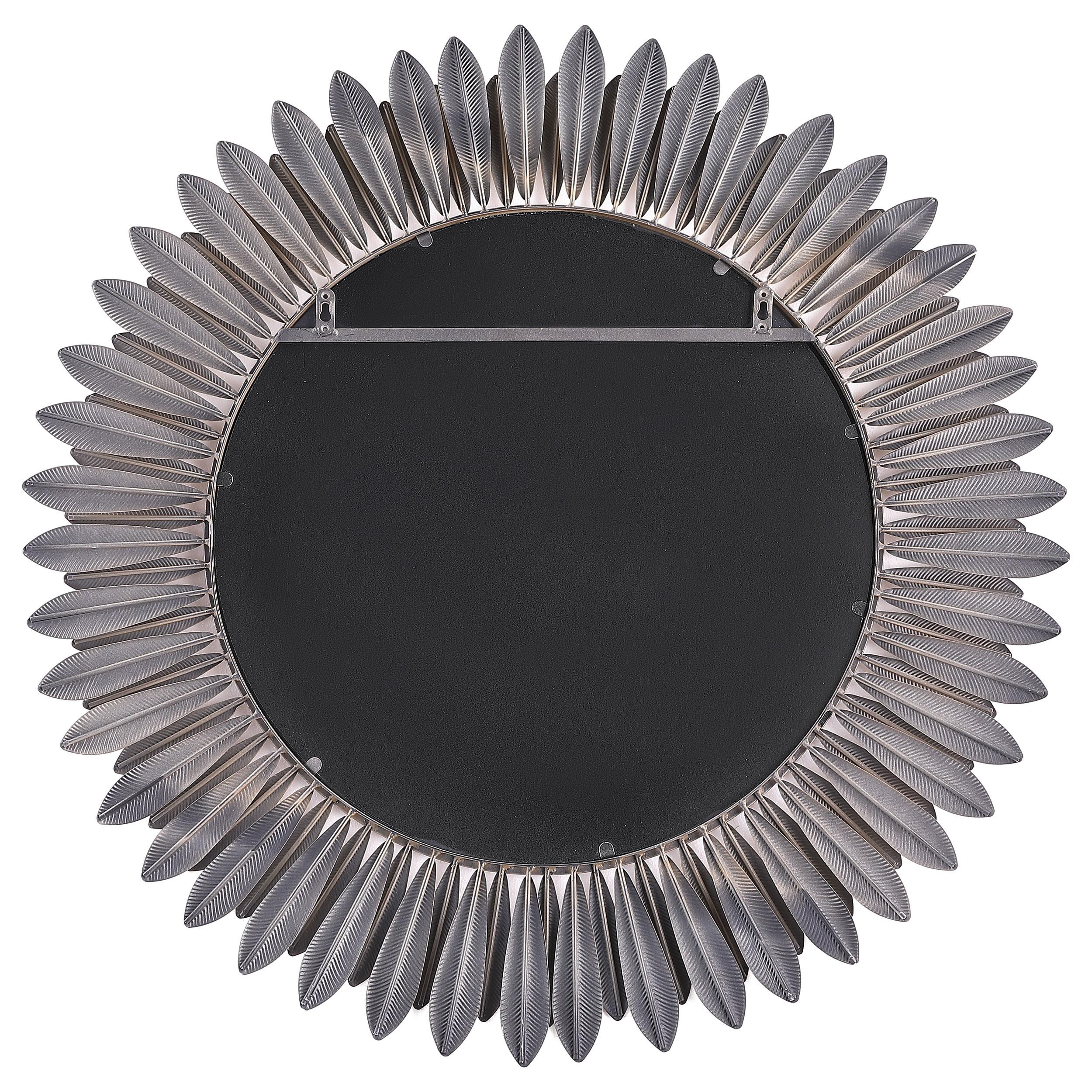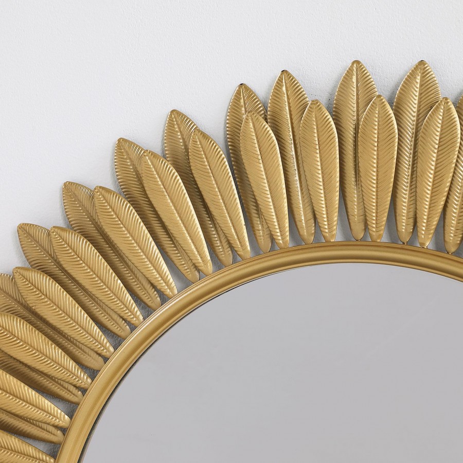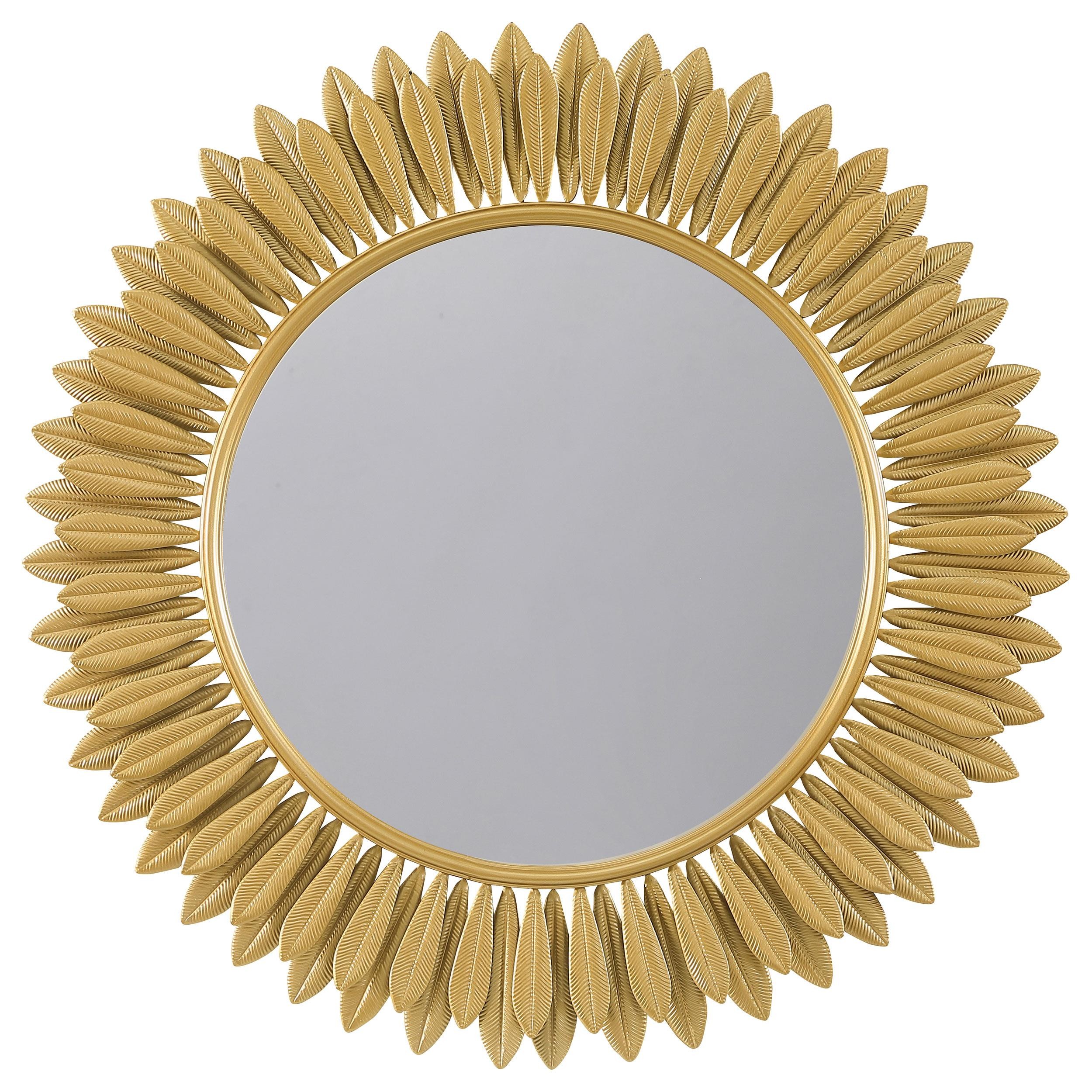 Instill the freshness of springtime in your living area or bedroom decor with a modern wall mirror. Offering sculptural presence, it boasts a center of round mirror glass. The frame is a double layer of delicate petals, introducing a floral element that creates cheerful energy in any setting. The mirror boasts a gold finish, evoking yellow daisies or bright sunflowers. Metal construction graces the frame, while MDF backing adds strength to 4mm thick mirror glass.
