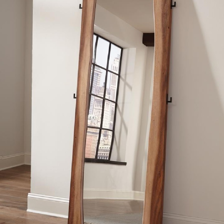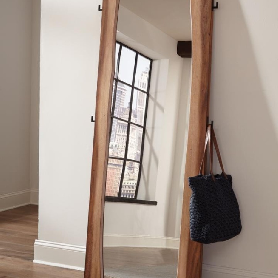 Put your best foot forward each and every day. This full-length floor mirror lets you walk out the door feeling confident from head to toe. Fashionable and functional, it features a striking wooden frame in an appealing, smokey walnut and coffee bean finish. Curvy edges between the frame and mirror give it an eye-catching look. This mirror's metal brackets allow you to easily affix it to any wall, making it ideal for a bedroom or walk-in closet.