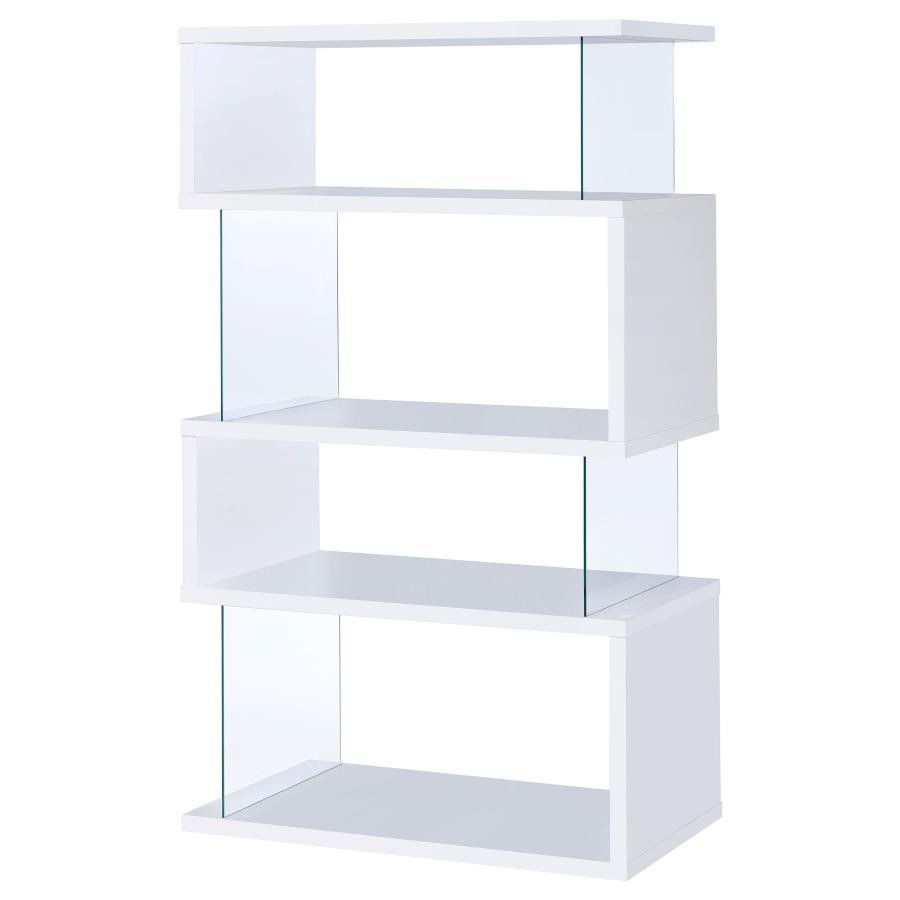 Creatively crafted, this bookcase enhances the modern aesthetic of any home. Its shelves are arranged in an eye-catching, zig-zag design, adding contemporary charm. Its silhouette is accentuated by clear tempered glass panels to complete its chic, trendy look. Expert craftsmanship and top quality materials lend strength and durability. It's available in four finishes, giving you attractive options to match your home decor.