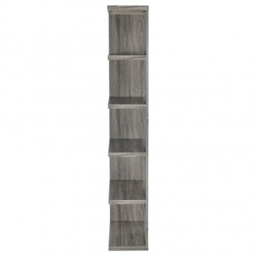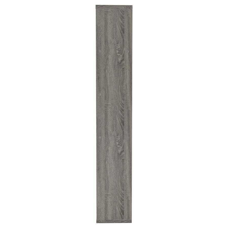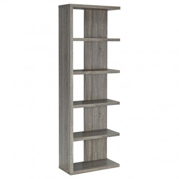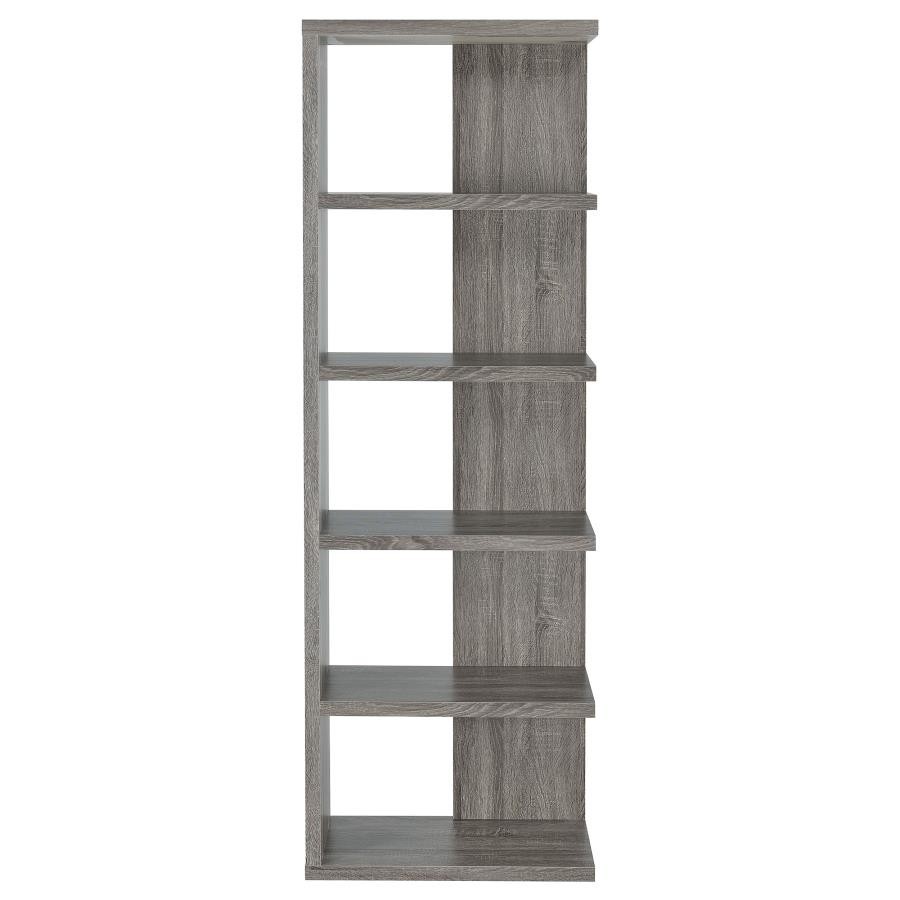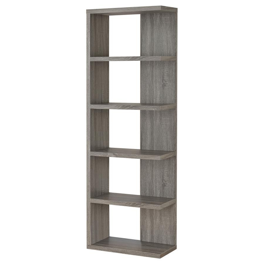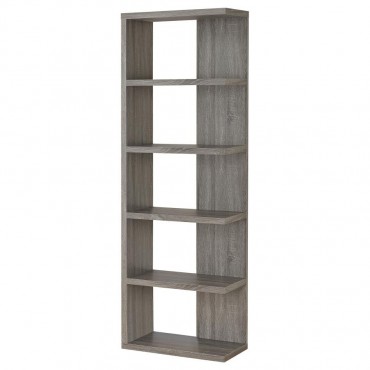 Add a touch of modern charm to any room with this stylish bookshelf in a weathered grey finish. Designed with a mix of open and backed shelving, it brings visual intrigue and versatility to your storage needs. Crafted from engineered wood and finished in eco-friendly melamine veneer, this unit offers five spacious tiers perfect for books, décor, and keepsakes in a contemporary home office or living space.