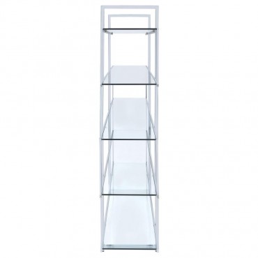 Jump on a trendy, modern bandwagon. Refresh a contemporary space with a stylish piece designed to organize and display. This four-tier bookcase offers a cool profile with personality. Tempered glass shelves blend perfectly with a steel frame. Make room for books, photos, and decor on this edgy, attitude-rich piece.