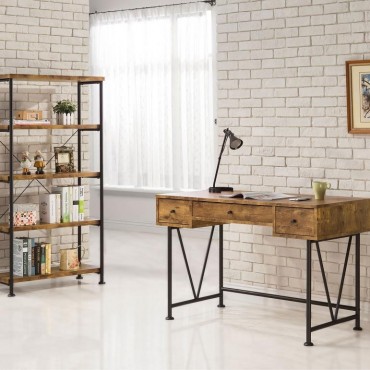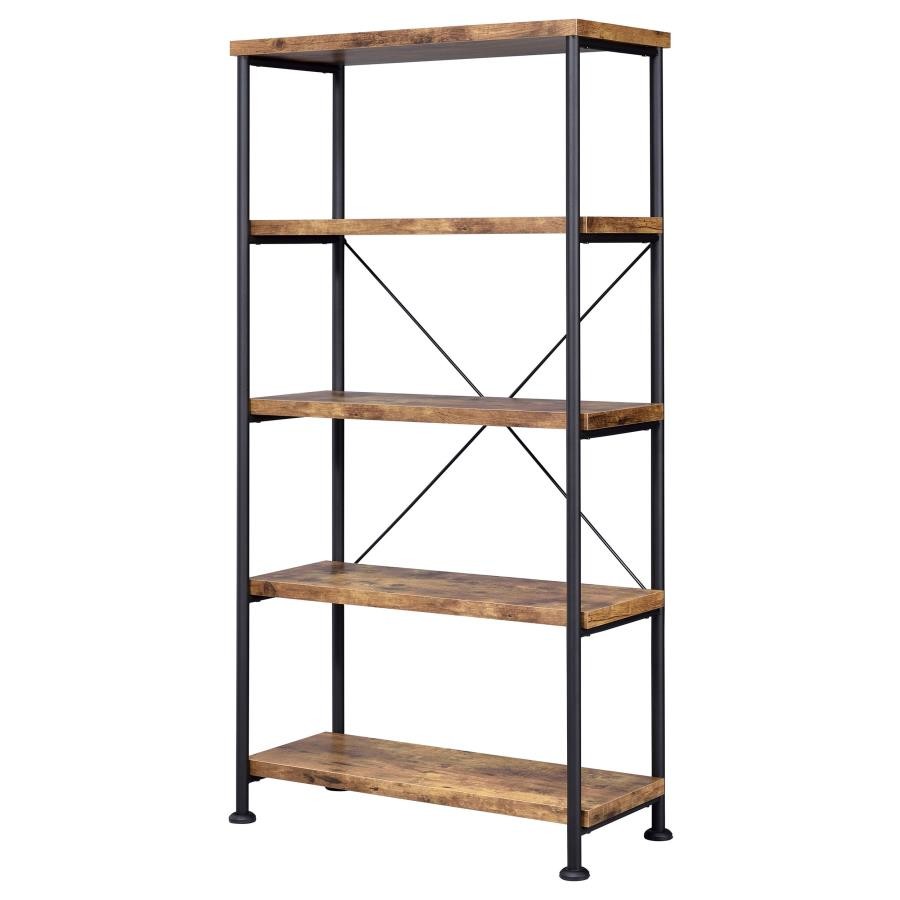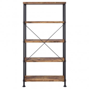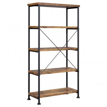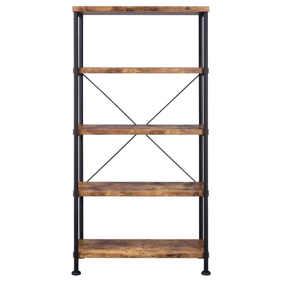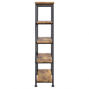 Keep important books handy with this eye-catching bookcase. Styled in an industrial motif, it blends antique nutmeg finish shelving with steel supports finished in black. Find plenty of space to store books and display accent decor. Place in a living room or family room as casual companion furniture. Four shelves and a top surface render this tall bookcase a perfect accent for an office or bedroom.