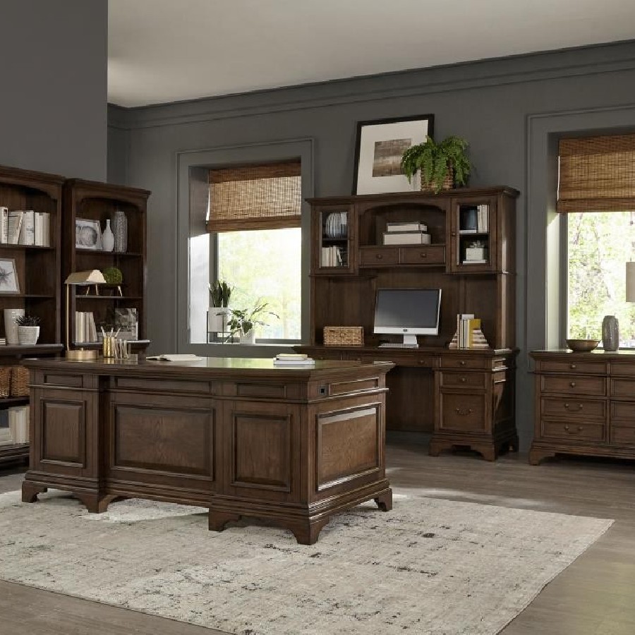 A stately upgrade for the traditional filing cabinet. This piece is crafted for classy office spaces. An expansive tabletop with molding accents offers an elegant option to place office items. Eight drawers flaunt round knobs and traditional style bar pulls. This piece is finished in burnished oak and supported on bracket style feet.