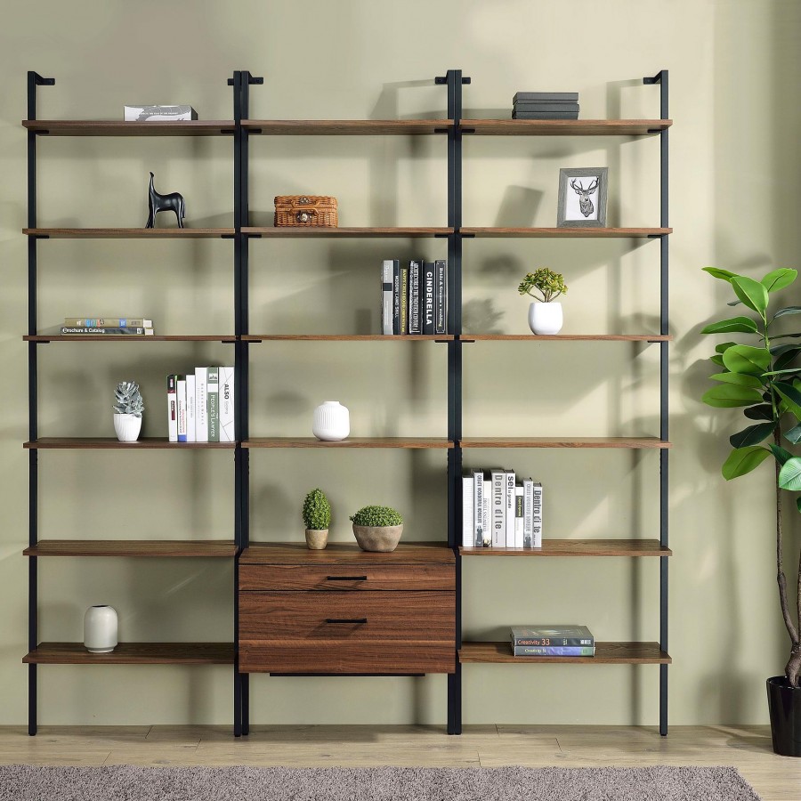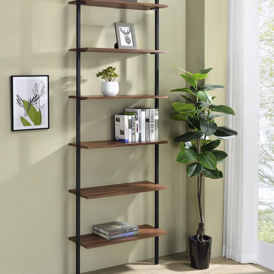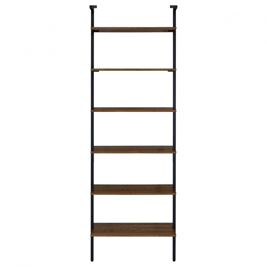 Curate your space to achieve a refined look and feel with this modern wall bookcase. Its elegant simplicity of silhouette brings light, airy ambiance in any space, maximizing space utilization without overwhelming. It features six open shelves in a walnut finish, each set within a black finish metal frame. The clean, chic lines of the frame attach to the wall at the top and drop to the floor, creating stability and minimalist appeal. Add a pair flanking your television for storage, or create a decorative vignette in a living or dining room.