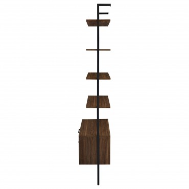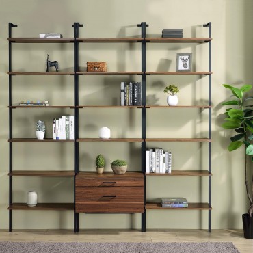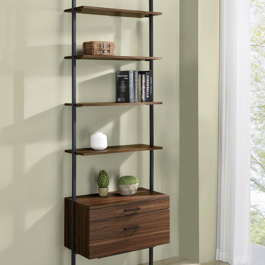 Play up the light, airy ambiance of a modern space while making use of every inch with a modern wall bookcase. It features four floating upper shelves and a lower case with two drawers, perfect for a blend of storage and display in any room. The shelves and two drawers feature a warm walnut finish over melamine paper, offering durability for a lovely look that lasts. A black finish metal frame supports the bookcase, offering neutral appeal in any setting. Stash essentials in the drawers while adding decor to shelves for a personal look and feel.