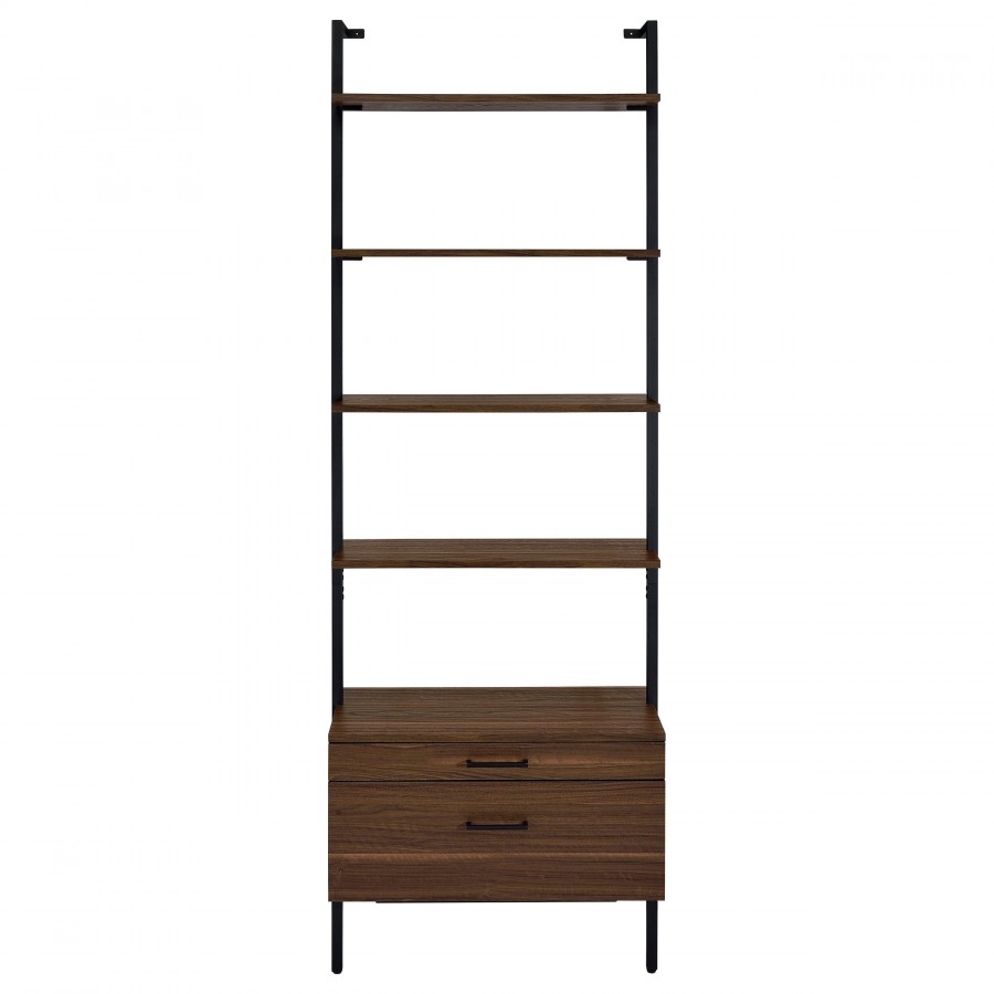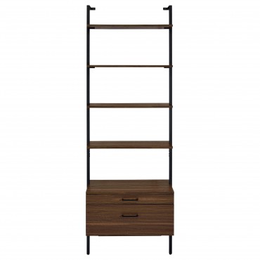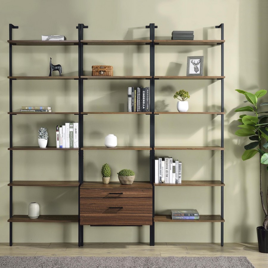 Elevate your home with this modern three-piece bookshelf set, combining sleek design with practical storage solutions. This set features two open shelf bookcases and one bookcase with drawers, each offering a refined and airy ambiance that complements any contemporary space. The open shelves are perfect for showcasing books, decor, and personal treasures, all set within a black metal frame that adds stability and minimalist appeal. The central bookcase includes two drawers, providing hidden storage to keep your space organized and clutter-free. Finished in a warm walnut tone, this versatile bookshelf set is ideal for creating a cohesive, stylish display in your living room, home office, or dining area.