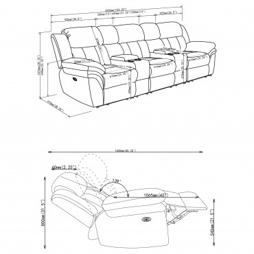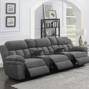 A trio of recliners and pair of consoles create a theater-inspired seating experience for your home. A modified power reclining sofa is the ultimate in indulgence, creating plush comfort and relaxation for movie marathons and Sunday game days. Charcoal fabric upholstery is smooth and soft, complementing seating designed for exceptional comfort and support. Each seat is divided with a storage console, offering a spot for snacks and essentials and offering a pair of cupholders that keep refreshments within reach. On either end of the sofa, pillowtop arms add plush, inviting style for your living area or dedicated media room.