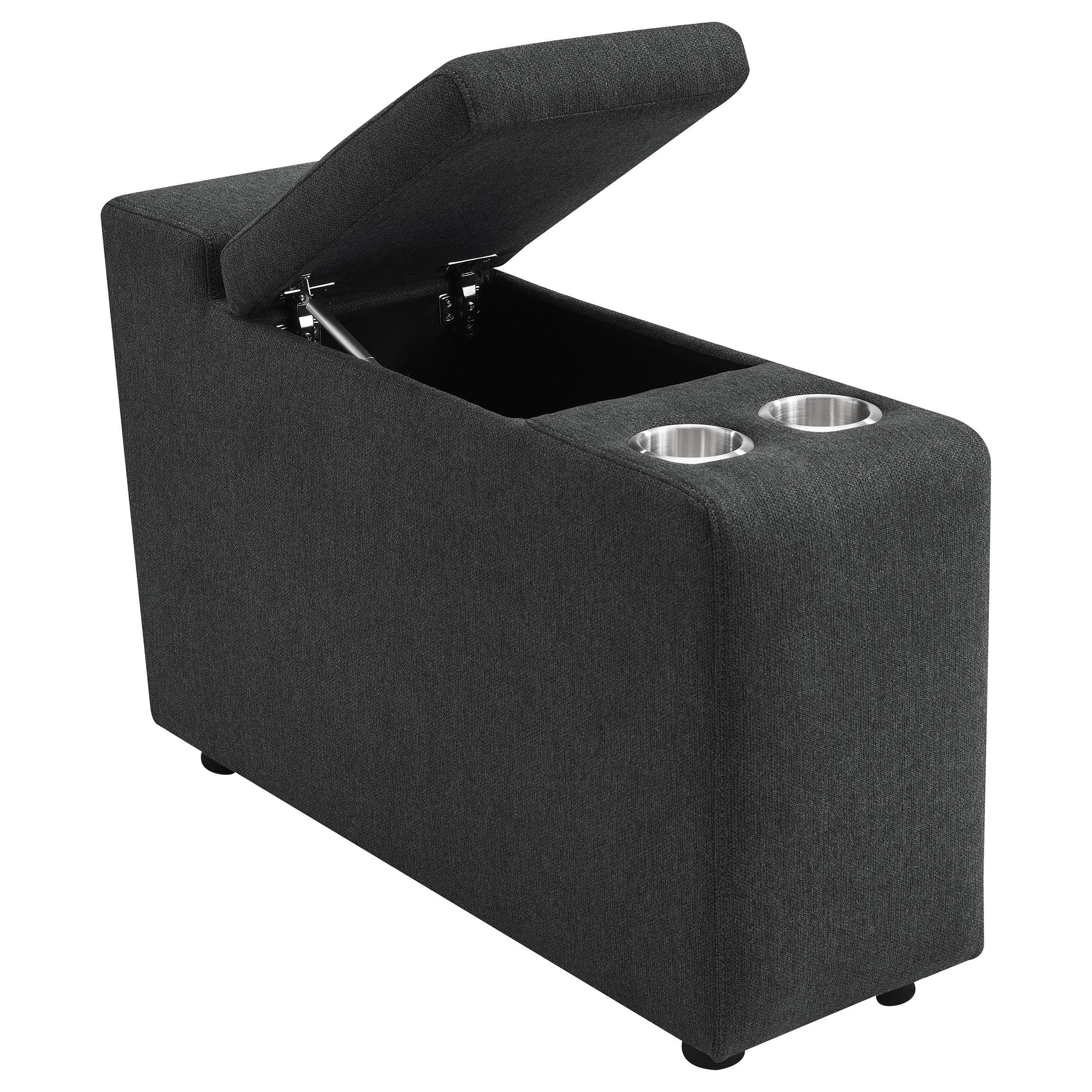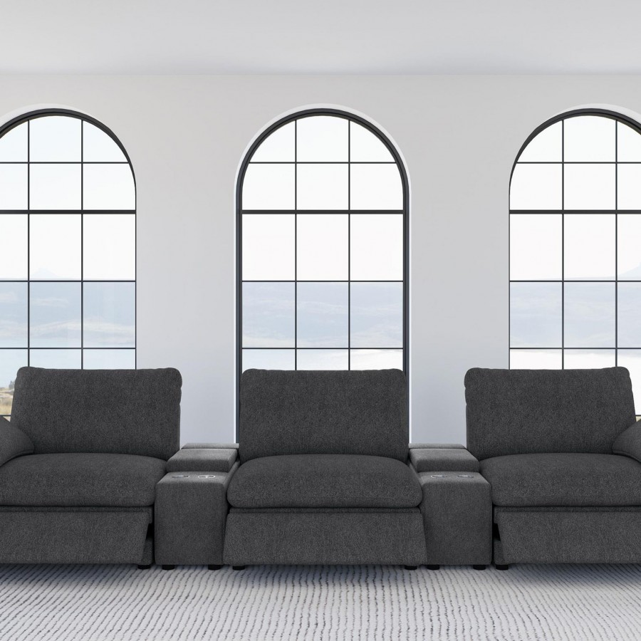 This three-seat home theater seating set combines modern convenience with plush comfort. Each power recliner offers smooth adjustability, while two center consoles feature lift-top storage and dual stainless steel cup holders. Upholstered in soft fabric, the generously padded cushions and pillow-top armrests enhance relaxation. Built for durability and long-lasting support, this seating arrangement is perfect for creating a cozy entertainment space.