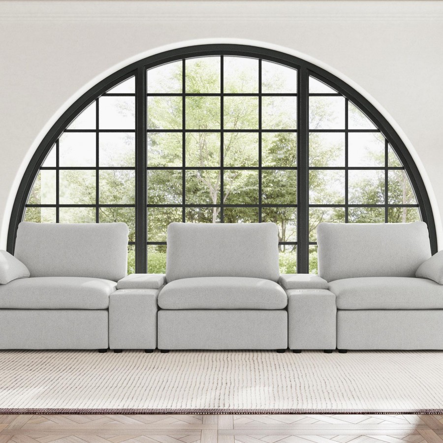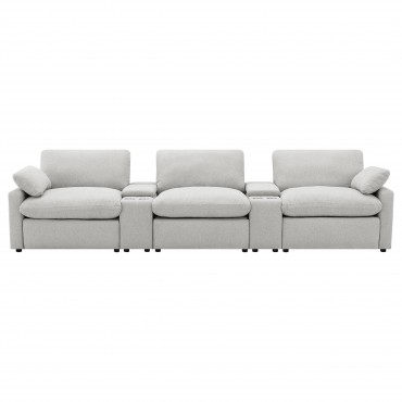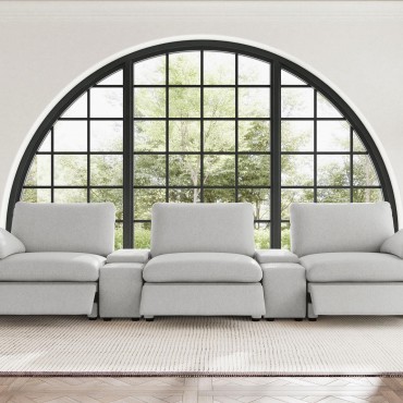 This three-seat home theater seating set combines modern convenience with plush comfort. Each power recliner offers smooth adjustability, while two center consoles feature lift-top storage and dual stainless steel cup holders. Upholstered in soft fabric, the generously padded cushions and pillow-top armrests enhance relaxation. Built for durability and long-lasting support, this seating arrangement is perfect for creating a cozy entertainment space.
