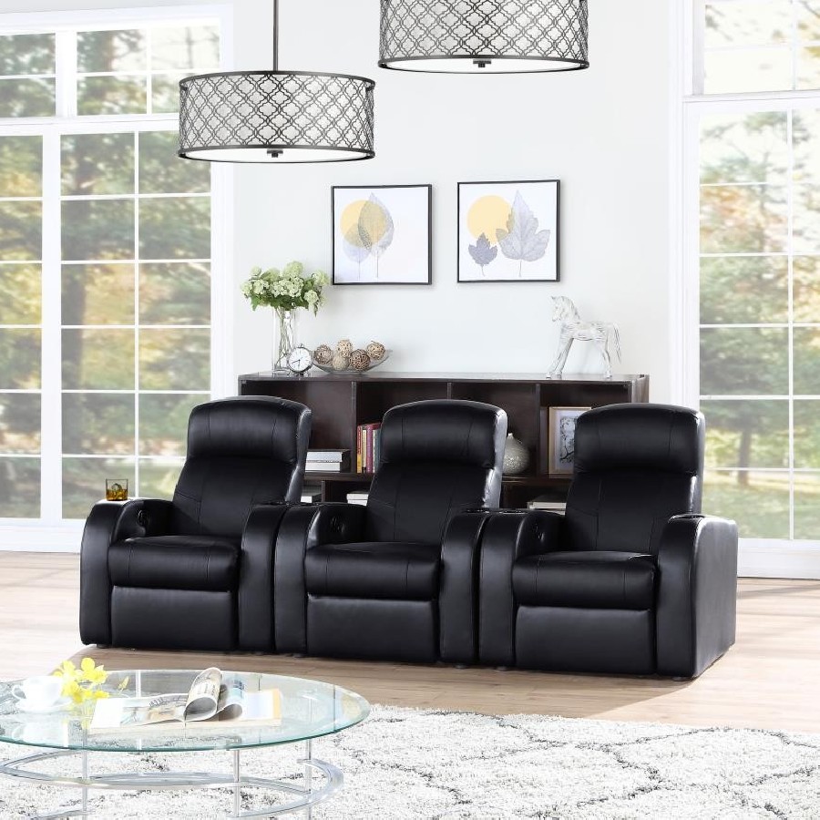 Experience cinematic luxury at home with this sleek home theater seating collection. Each recliner is upholstered in smooth black top grain leather everywhere the body touches, offering both elegance and durability. Designed with high backs, supportive pocket coil seating, and wall-hugger mechanisms, the recliners maximize comfort and save space. Built-in cupholders provide convenience, while optional wedge consoles add soft-closing storage for remotes and accessories. Modern stitching and rounded track arms complete the refined look, making this collection the ultimate in home entertainment seating.