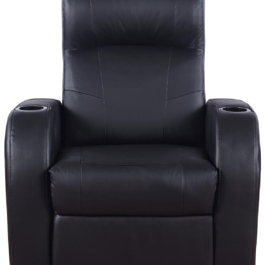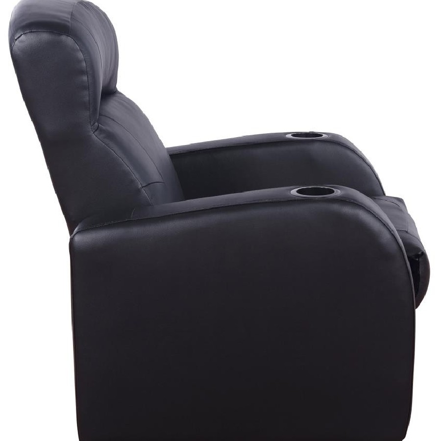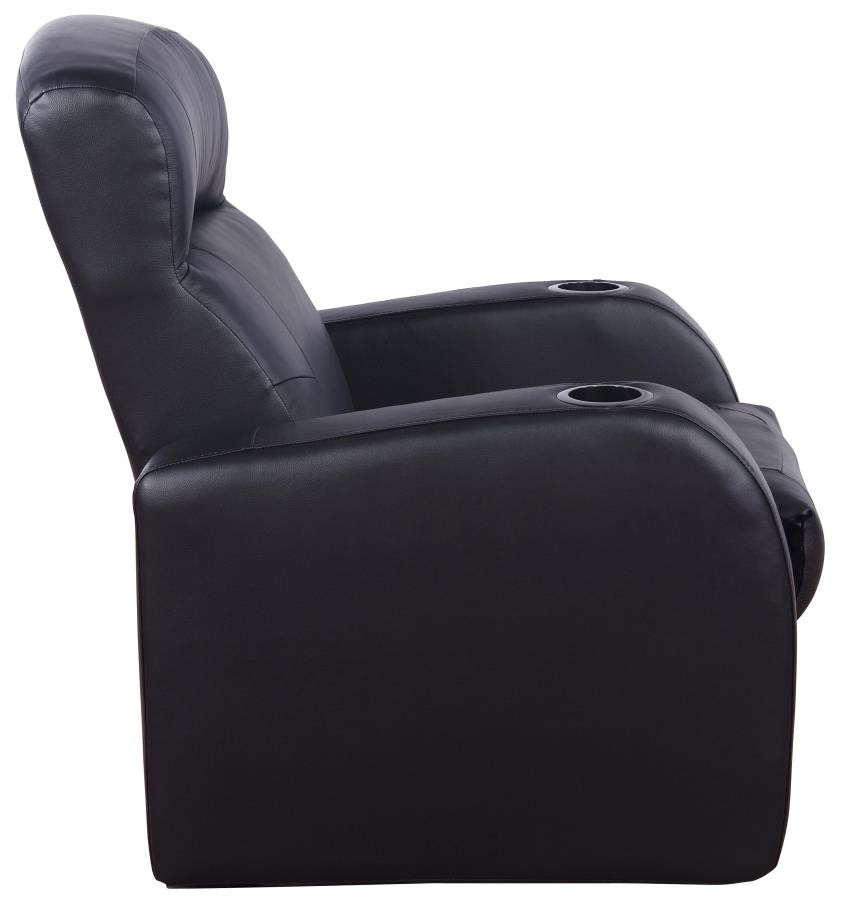 Experience cinematic luxury at home with this sleek home theater seating collection. Each recliner is upholstered in smooth black top grain leather everywhere the body touches, offering both elegance and durability. Designed with high backs, supportive pocket coil seating, and wall-hugger mechanisms, the recliners maximize comfort and save space. Built-in cupholders provide convenience, while optional wedge consoles add soft-closing storage for remotes and accessories. Modern stitching and rounded track arms complete the refined look, making this collection the ultimate in home entertainment seating.