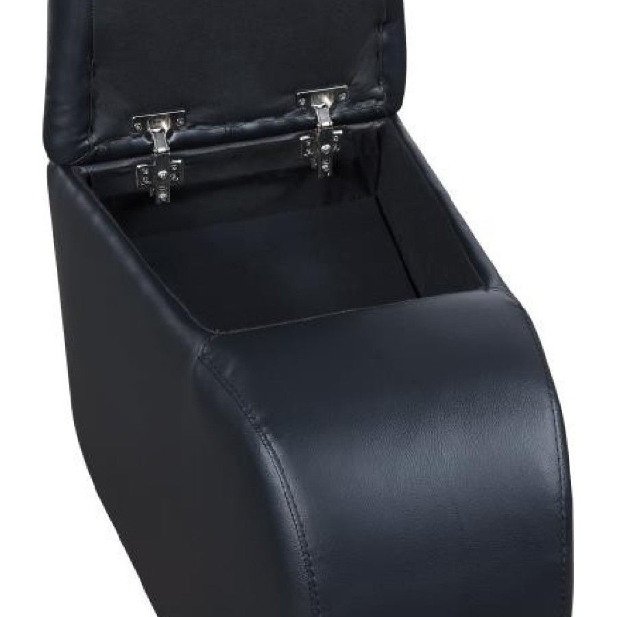 Elevate your home theater with this sleek wedge console, designed to pair seamlessly between recliners. Upholstered in smooth black top grain leather, it adds a polished look while offering everyday convenience. A soft-closing lift-top storage compartment provides space for remotes and accessories, while integrated cupholders enhance functionality. Built with a sturdy frame and supportive cushioning, this console combines durability with modern style, making it an essential element of a customized theater seating arrangement.