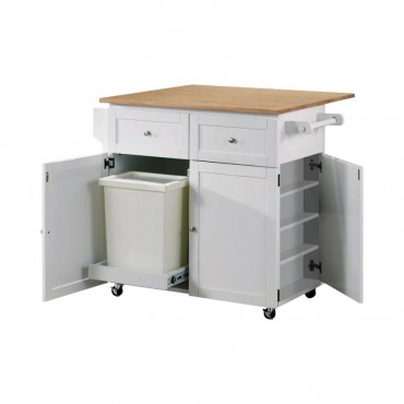 Make your kitchen as functional and fashionable as possible. With a bright modern farmhouse motif, this kitchen cart organizes tasks and storage options into one central unit. Solid rubberwood offers a stylish composition that shows off a butcher block work surface. Fresh white and natural brown finish deliver decor versatility. Keep tasks simple with a towel rack, spice rack, a hidden cabinet for trash, and casters for portability.