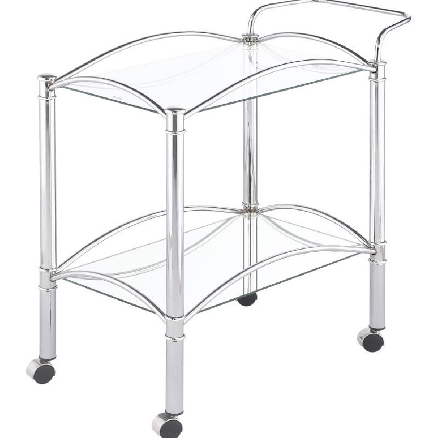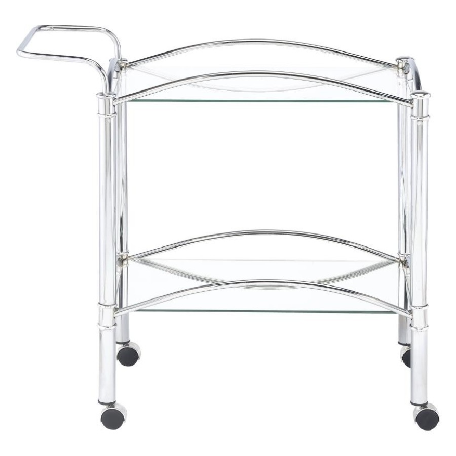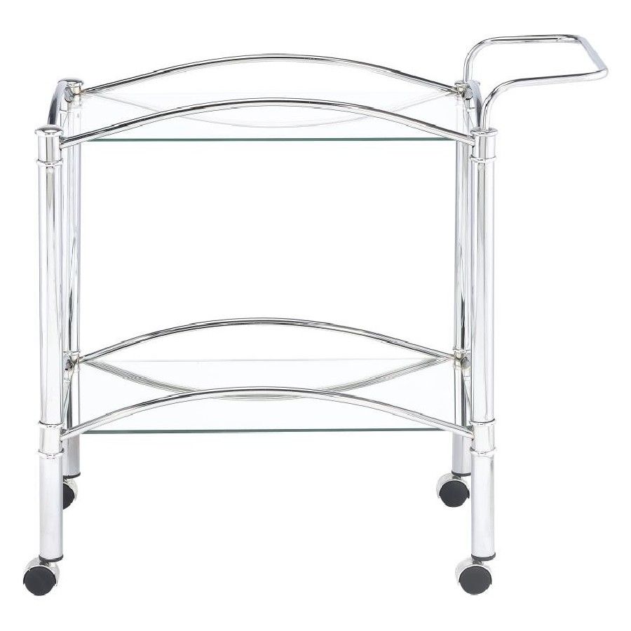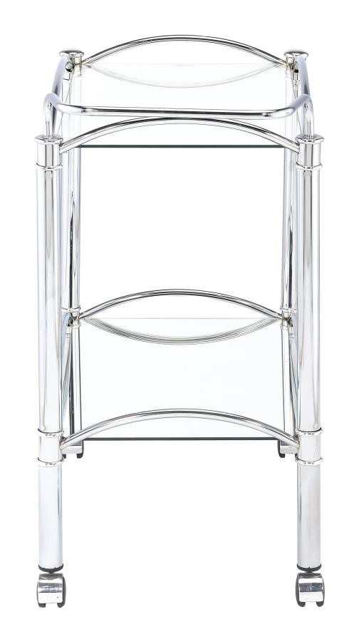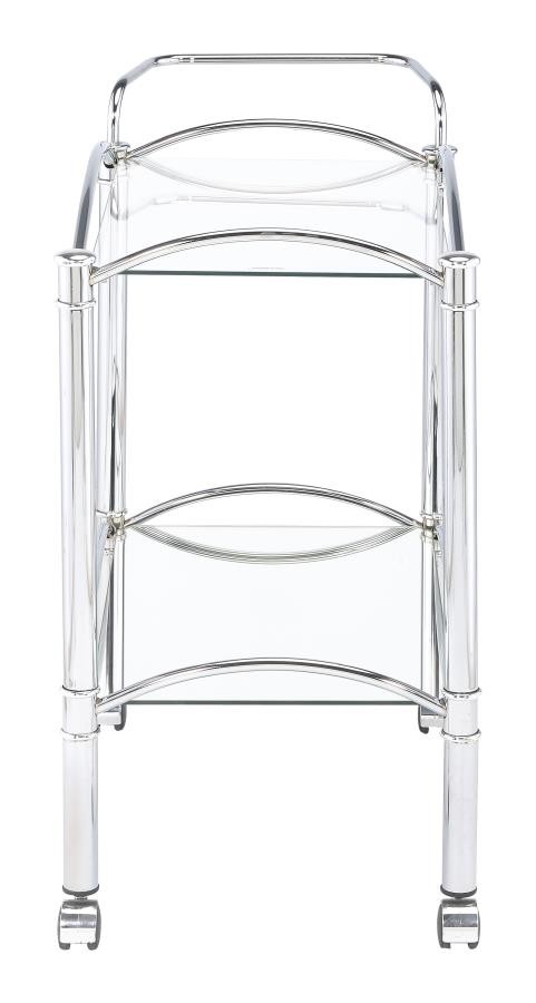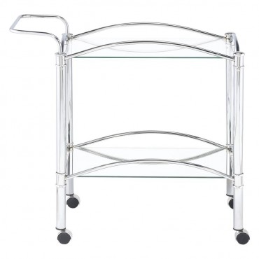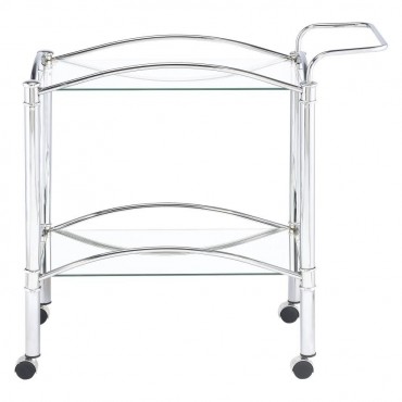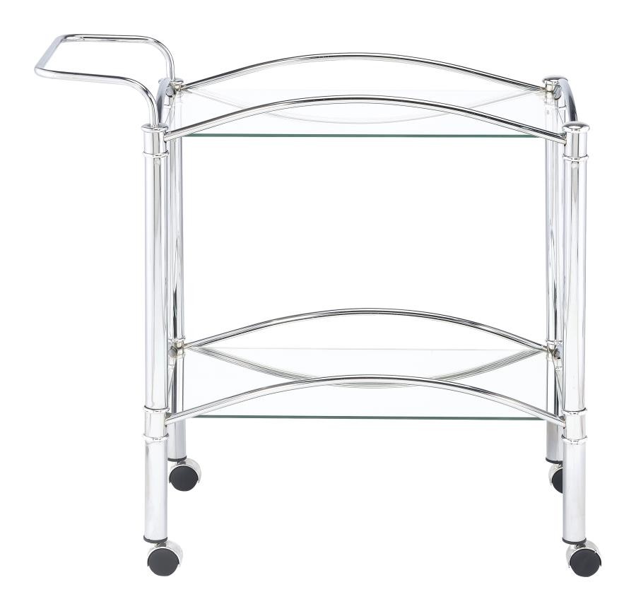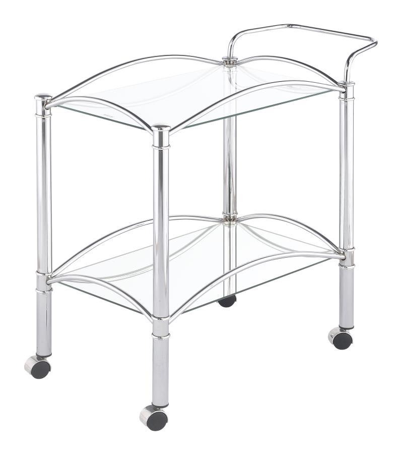 Simple elegance with a modern twist. This freshly styled serving cart offers a tasteful addition to contemporary decor. With a sleek chrome finish, its metal frame receives romantic curved accents. A tempered glass top shelf and mirrored bottom shelf accommodate beverages, food, and implements. Casters allow mobility to work the room easily.