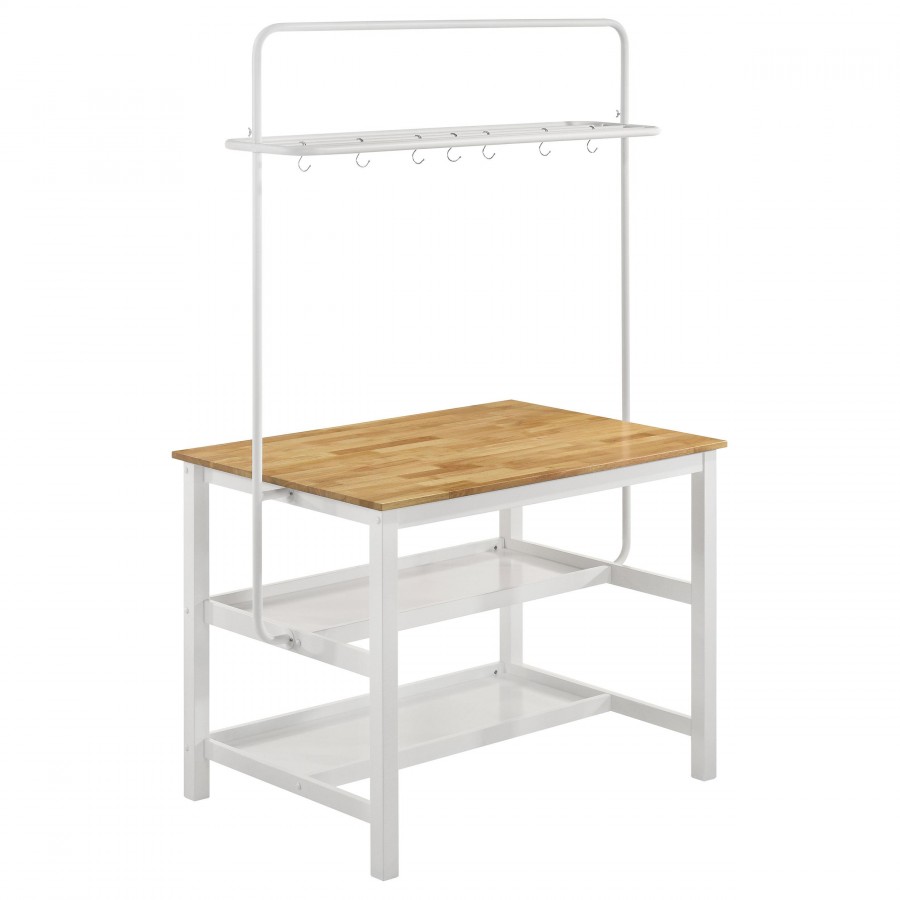 Embrace multifunctionality with a modern farmhouse three-piece kitchen island set. Its tabletop serves as easy prep space for cooking and can be used to serve meals as two included stools provide easy seating in your kitchen. The table includes two lower shelves and an upper pot rack, which adds one shelf and ten S-type hooks for versatile storage. The set delivers casual ambiance, featuring rubberwood on its tabletop and the seats of the stools in a natural finish that adds warmth. The island and stools are built with metal frames, each in a crisp white finish that's sure to complement in any setting.