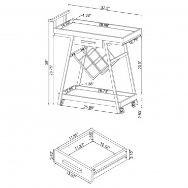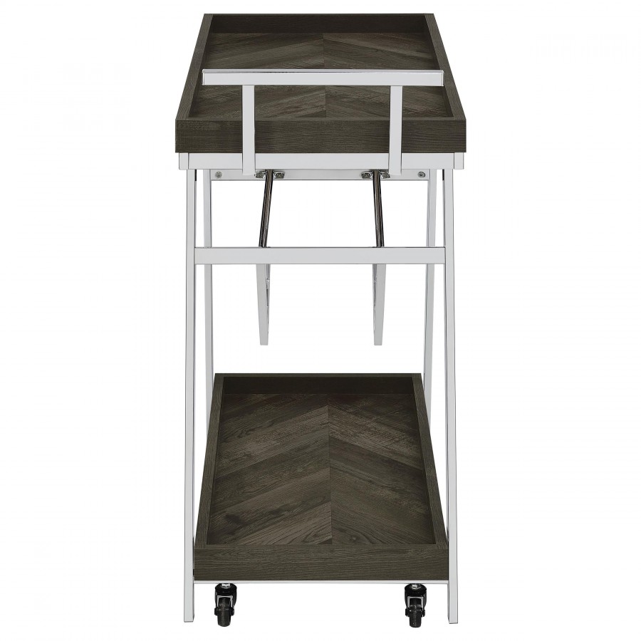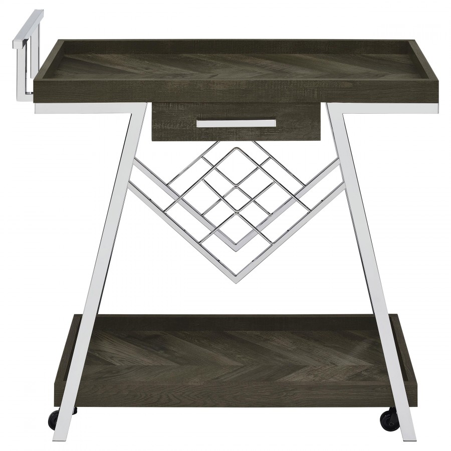 Social gatherings are a breeze with a modern bar cart offering convenience and portability. With a fresh updated design, this grey bar cart adds a fresh look with plenty of functionality. Wood products and paper create a rectangular top and lower shelf for serving and storage, as well as a slide-out drawer to stash incidentals. Silver framing offers angled silhouetting with a linear pull and wheels allowing for movement around your casual space. Store up to four wine bottles in an angled compartment.