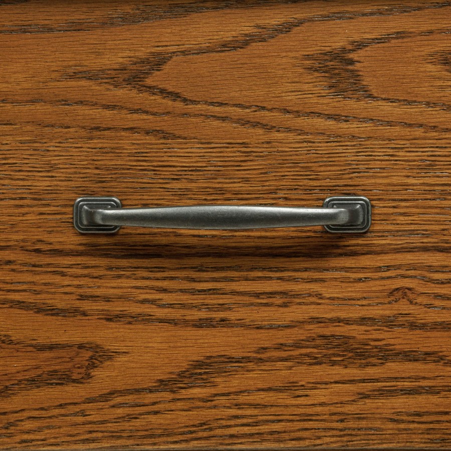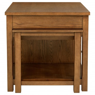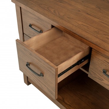 Designed with everyday flexibility in mind, this kitchen island combines storage, seating, and workspace in a single, streamlined footprint. Ten drawers with dark grey pulls keep utensils and tools close at hand, while a spacious open shelf adds room for bulkier items. A pull-out extension table slides smoothly from the side, transforming the island into a meal prep zone or dining spot. Two backless stools store discreetly underneath on built-in stemware-style supports, blending function with rustic charm in a warm dark oak finish.